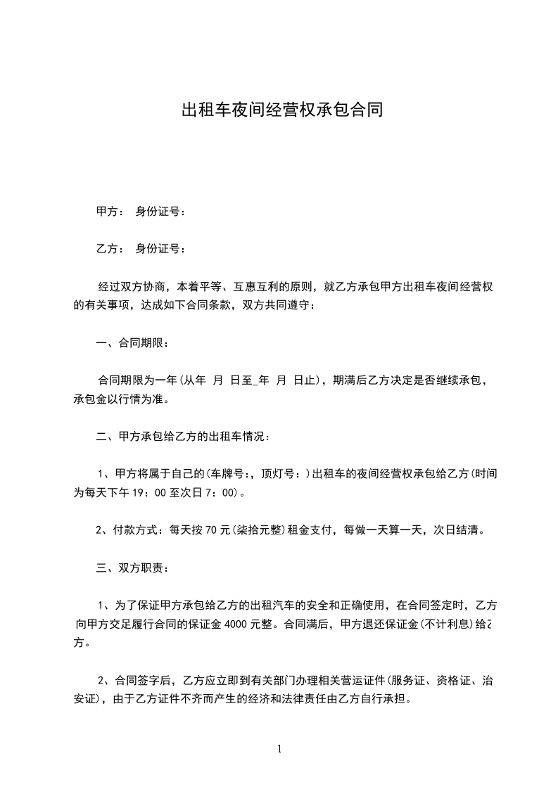 1、甲方将属于自己的(车牌号:,顶灯号:)出租车的夜间经营权承包给乙方(时间为每天下午19:00至次日7:00)。