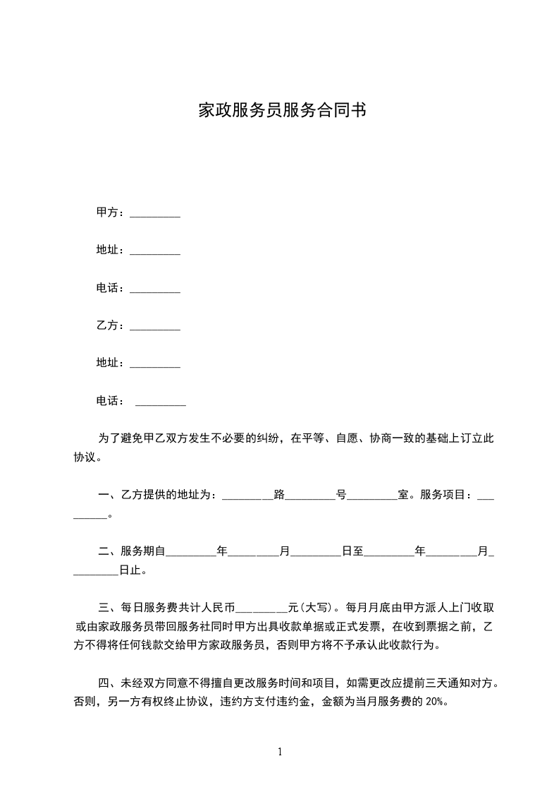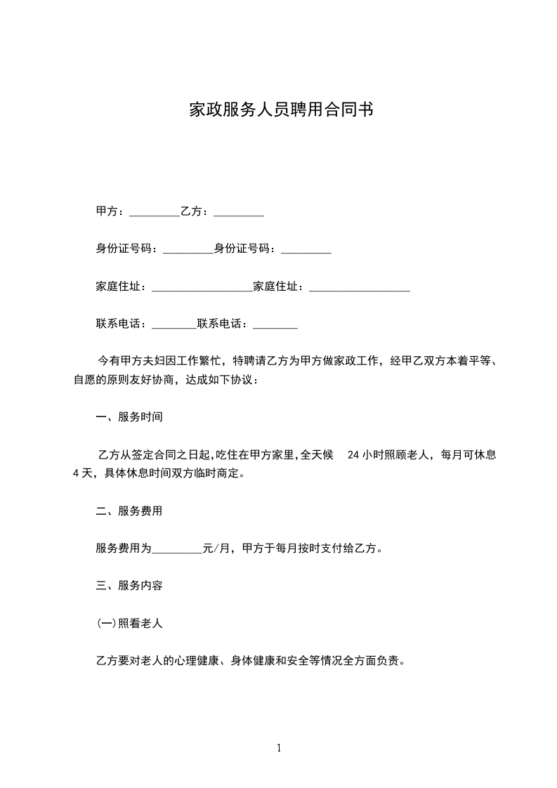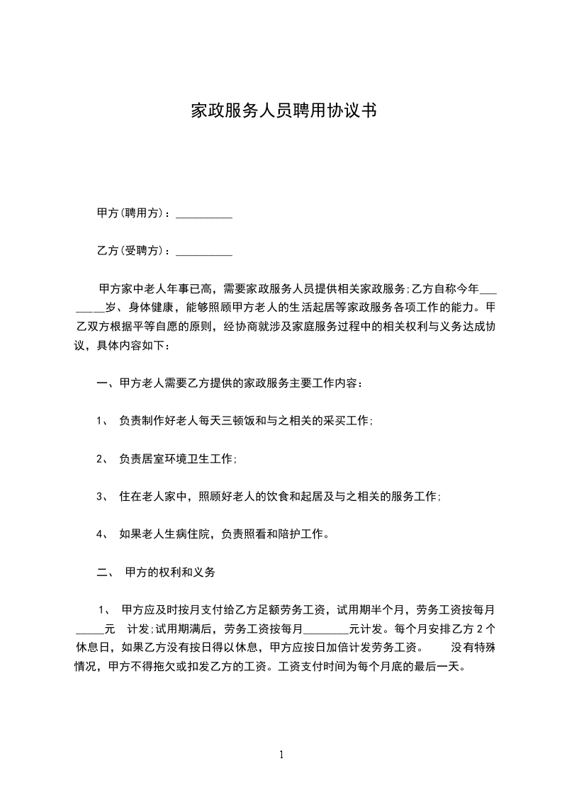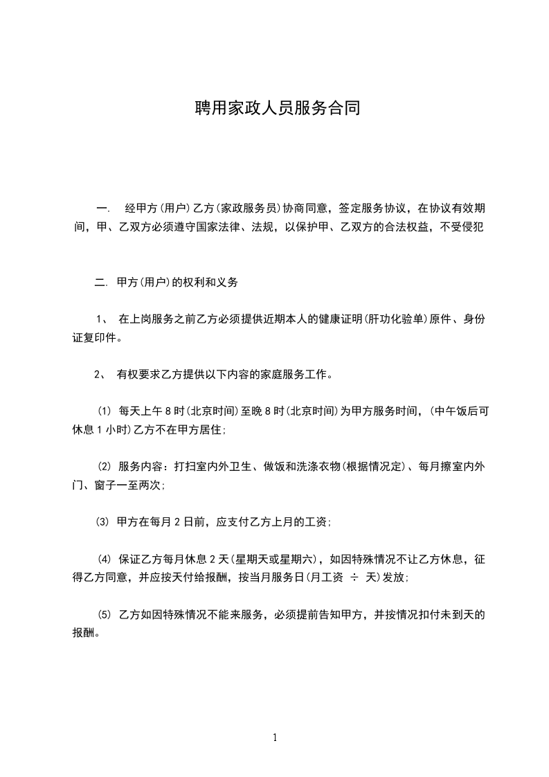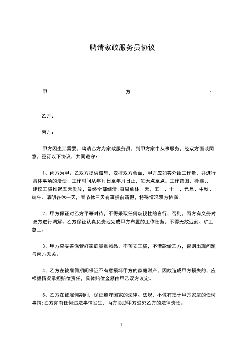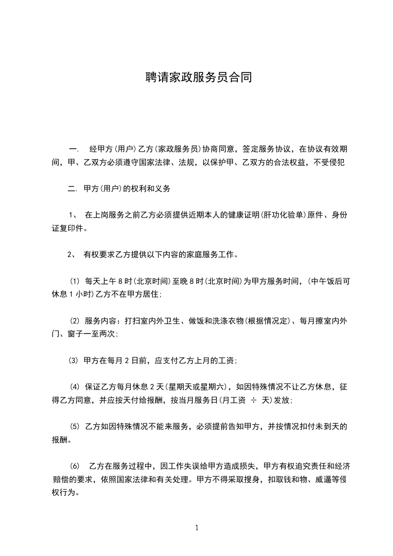 一. 经甲方(用户)乙方(家政服务员)协商同意,签定服务协议,在协议有效期间,甲、乙双方必须遵守国家法律、法规,以保护甲、乙双方的合法权益,不受侵犯。