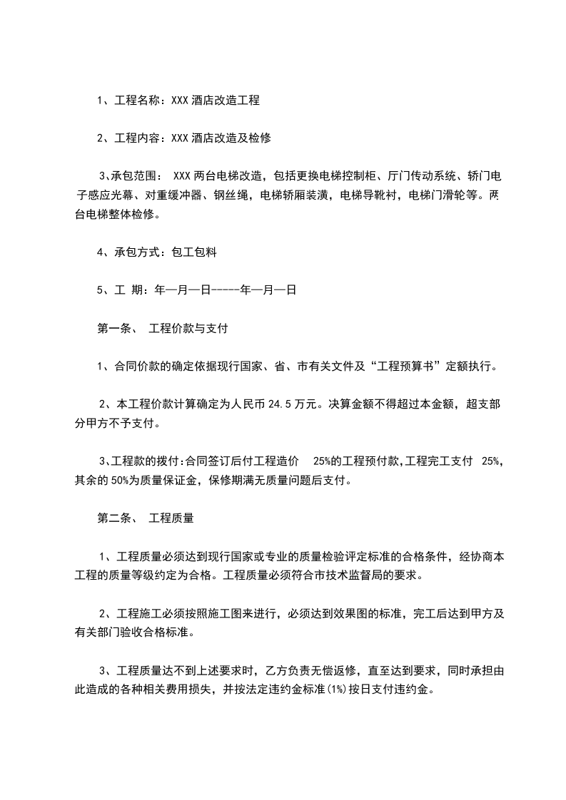 3、承包范围:XXX两台电梯改造,包括更换电梯控制柜、厅门传动系统、轿门电子感应光幕、对重缓冲器、钢丝绳,电梯轿厢装潢,电梯导靴衬,电梯门滑轮等。两台电梯整体检修。