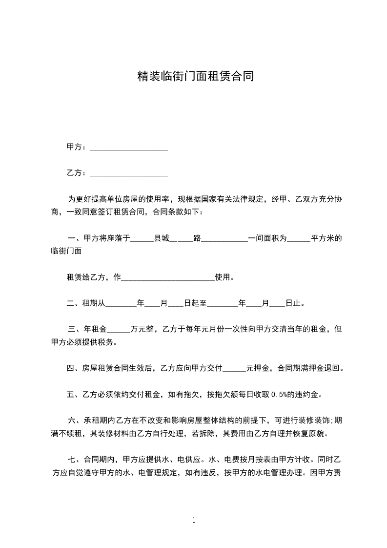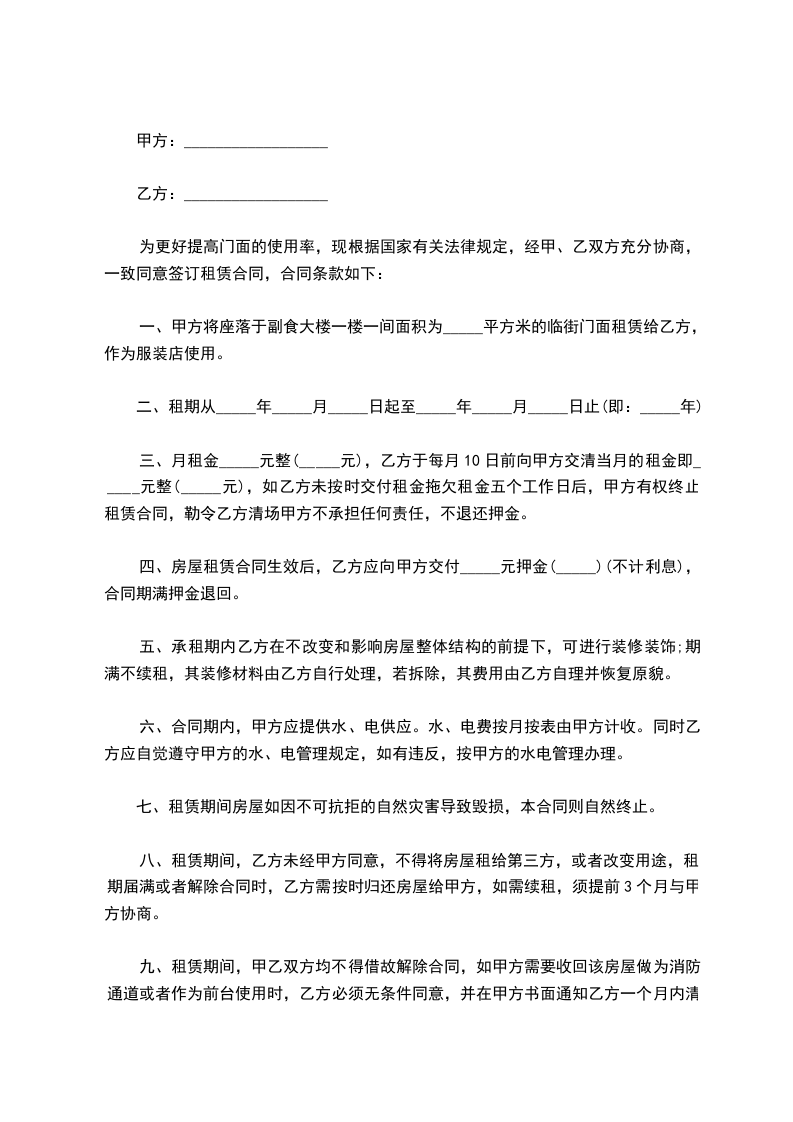 一、甲方将座落于副食大楼一楼一间面积为_____平方米的临街门面租赁给乙方,作为服装店使用。