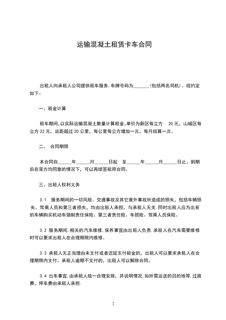 租车期间,以实际运输混凝土数量计算租金。单价为新区每立方20元,山城区每立方22元,运距超过20公里,每公里每立方增加一元,每月结算一次。