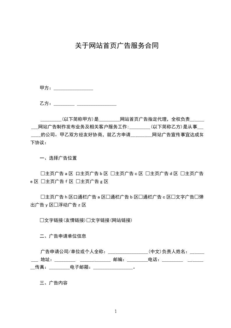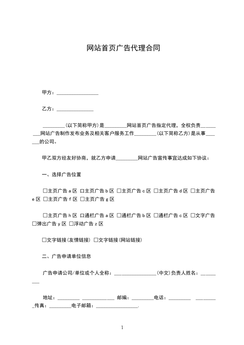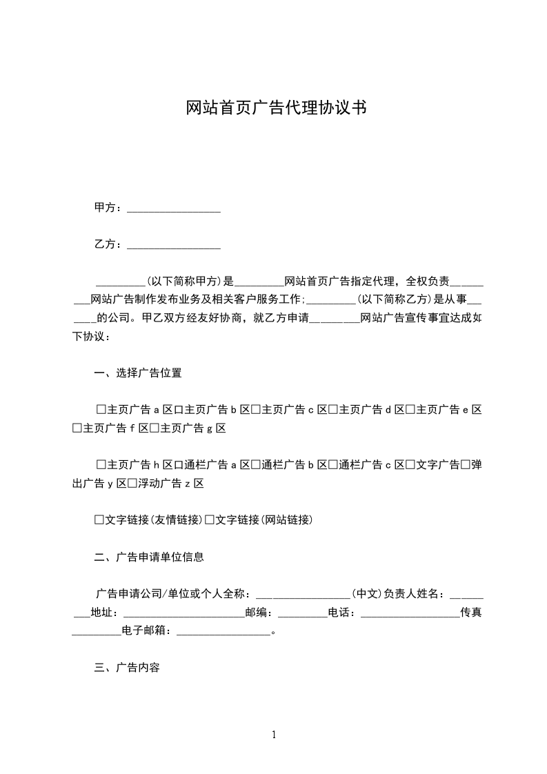 _________(以下简称甲方)是_________网站首页广告指定代理,全权负责_________网站广告制作发布业务及相关客户服务工作;_________(以下简称乙方)是从事_______的公司。甲乙双方经友好协商,就乙方申请_________网站广告宣传事宜达成如下协议: