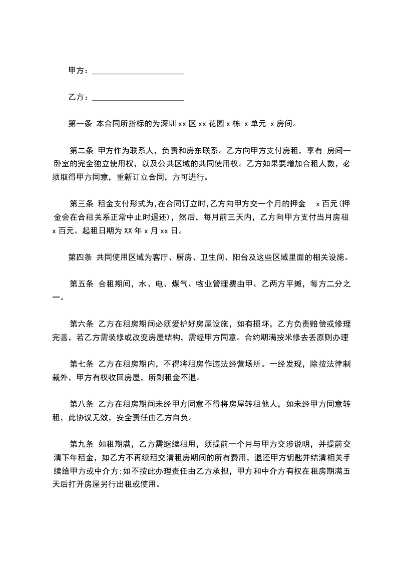 第二条 甲方作为联系人,负责和房东联系。乙方向甲方支付房租,享有 房间一卧室的完全独立使用权,以及公共区域的共同使用权。乙方如果要增加合租人数,必须取得甲方同意,重新订立合同,方可进行。