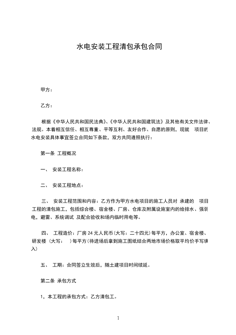 根据《中华人民共和国民法典》、《中华人民共和国建筑法》及其他有关文件法律、法规。本着相互信任、相互尊重、平等互利、友好合作、自愿的原则,现就 项目的水电安装具体事宜签立合同如下条款,双方共同遵照执行: