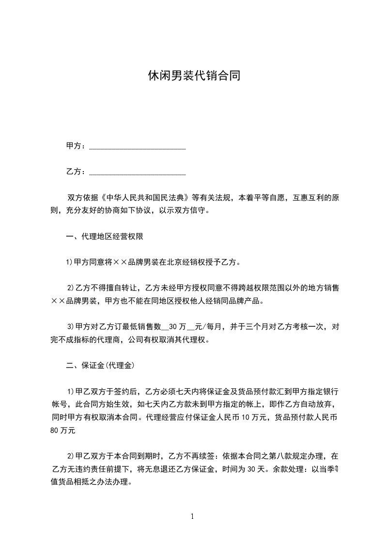 1)甲方同意将××品牌男装在北京经销权授予乙方。