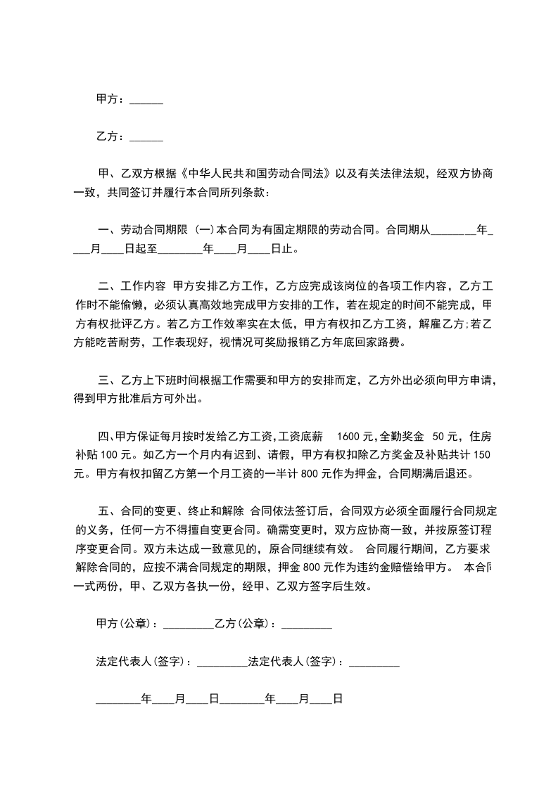 工厂技术员工固定期限劳动协议