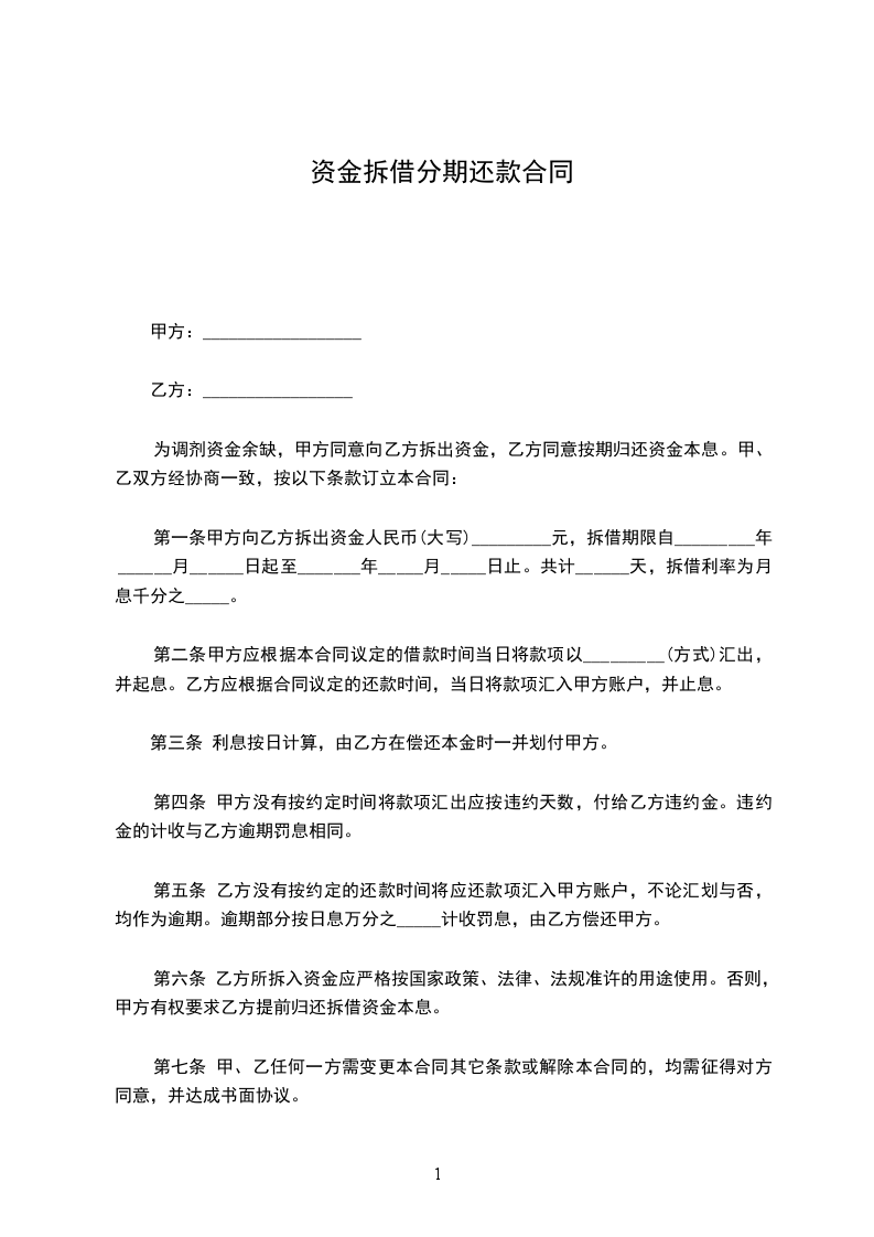 一、由于乙方资金确实紧张,致使_______合同项下的资金不能落实。如不及时解决将严重影响到合同的履行。为保证履约,维护对外信誉,甲方应乙方的申请,同意借给部分资金。金额为人民币_______元。