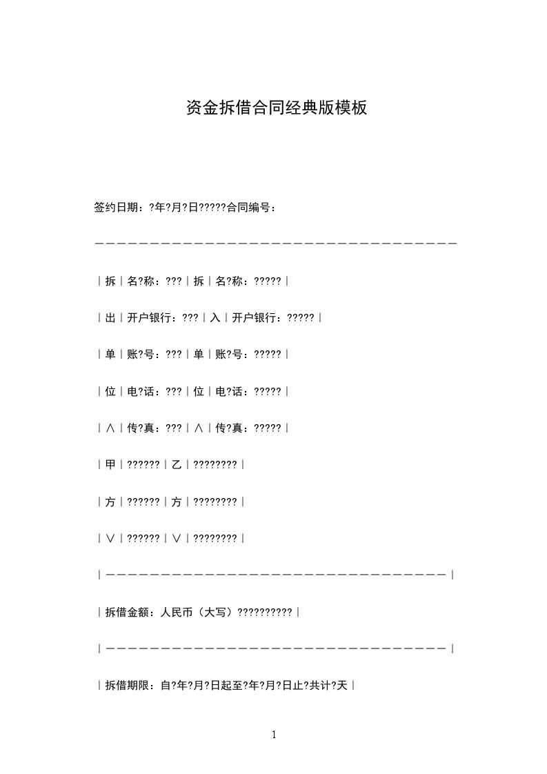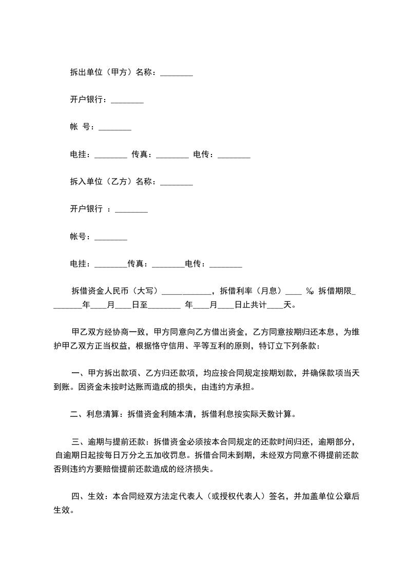 拆借资金人民币(大写)____________,拆借利率(月息)____ ‰,拆借期限________年____月____日至________ 年____月____日止共计____天。