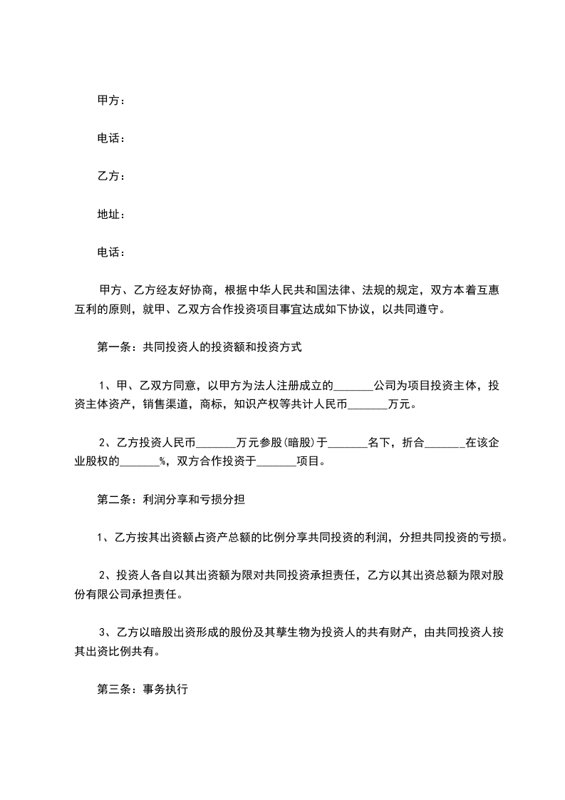 2、乙方投资人民币_______万元参股(暗股)于_______名下,折合_______在该企业股权的_______%,双方合作投资于_______项目。