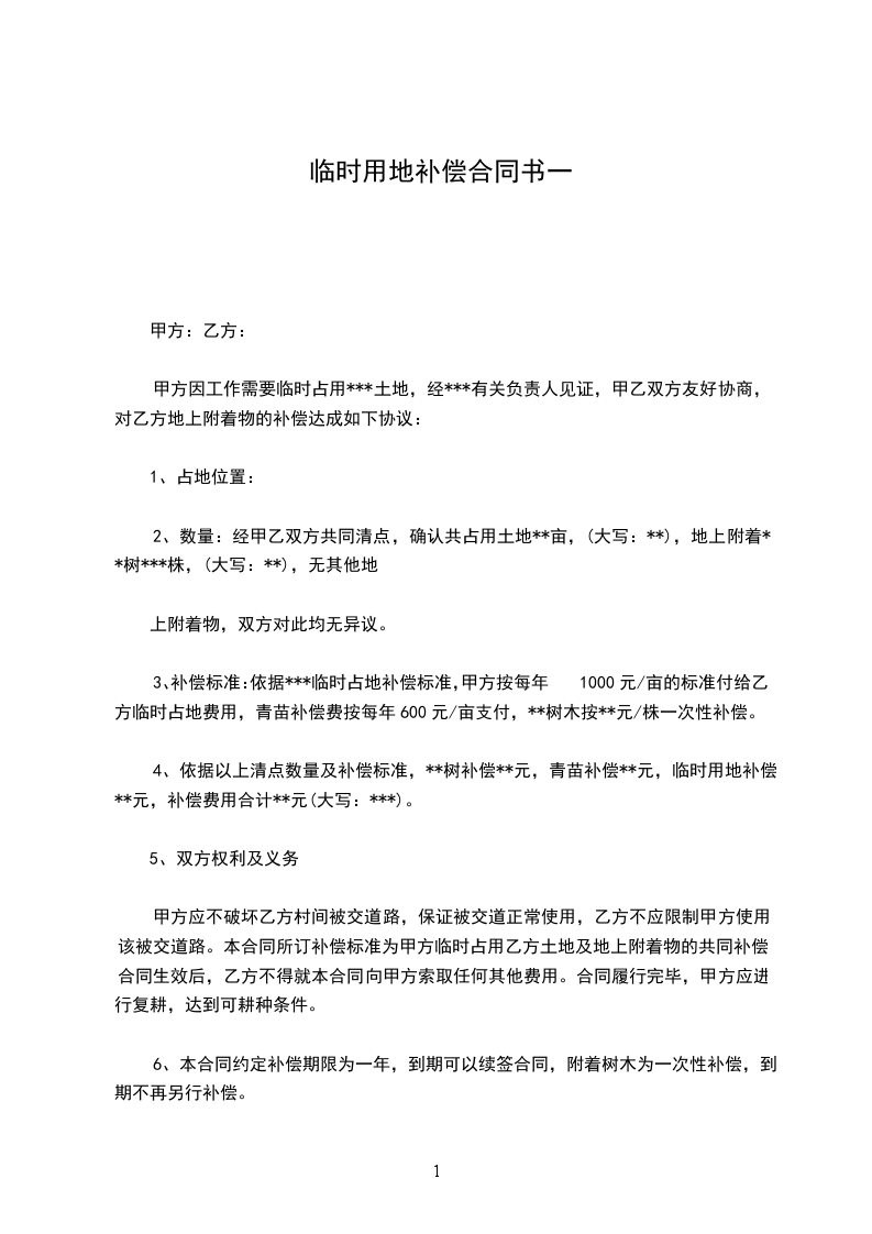3、补偿标准:依据***临时占地补偿标准,甲方按每年1000元/亩的标准付给乙方临时占地费用,青苗补偿费按每年600元/亩支付,**树木按**元/株一次性补偿。