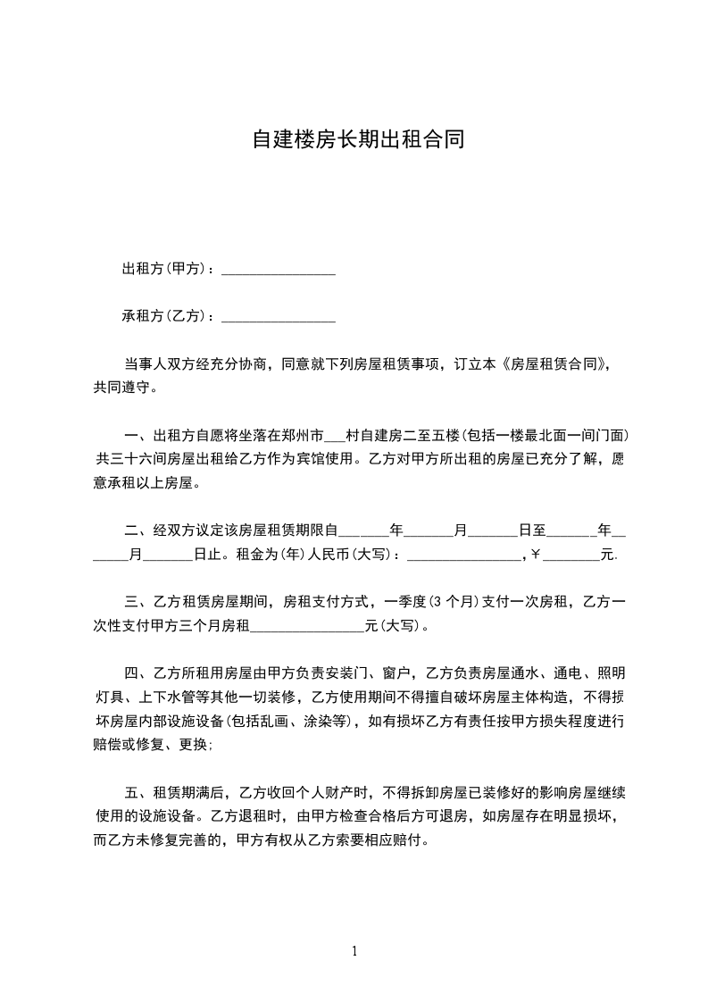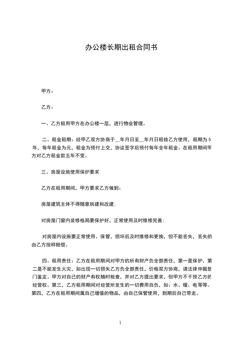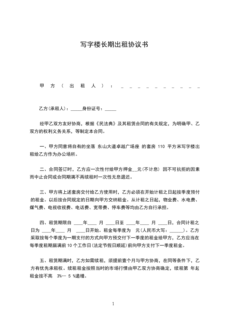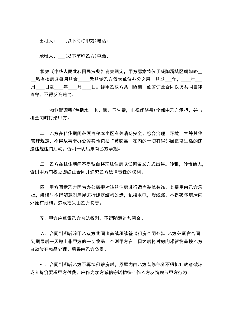 根据《中华人民共和国民法典》有关规定,甲方愿意将位于咸阳渭城区朝阳路____私有楼房以每月租金_____元租给乙方仅为单位办公之用。租期___年,____年___月____日至____年____月____日。经甲乙双方共同协商一致签订此合同以资共同自律遵守,不得反悔违约。