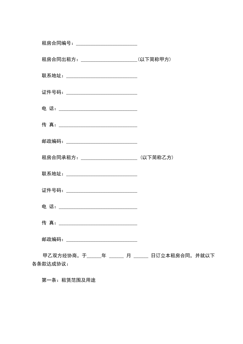 甲乙双方经协商,于______年 ______ 月 ______ 日订立本租房合同,并就以下各条款达成协议: