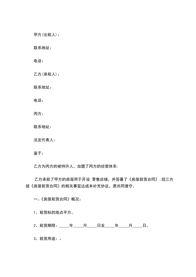 乙方承租了甲方的房屋用于开设 零售店铺,并签署了《房屋租赁合同》;现三方就《房屋租赁合同》的相关事宜达成本补充协议,愿共同遵守。