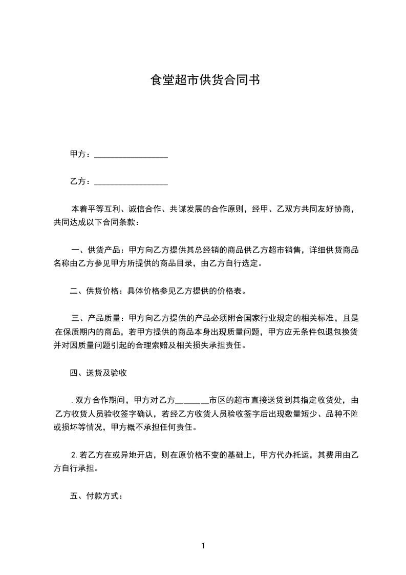 一、供货产品:甲方向乙方提供其总经销的商品供乙方超市销售,详细供货商品名称由乙方参见甲方所提供的商品目录,由乙方自行选定。