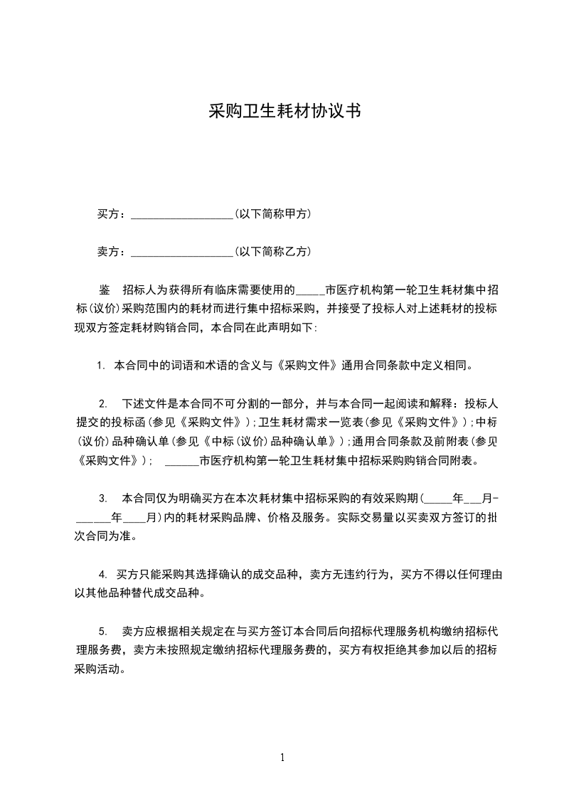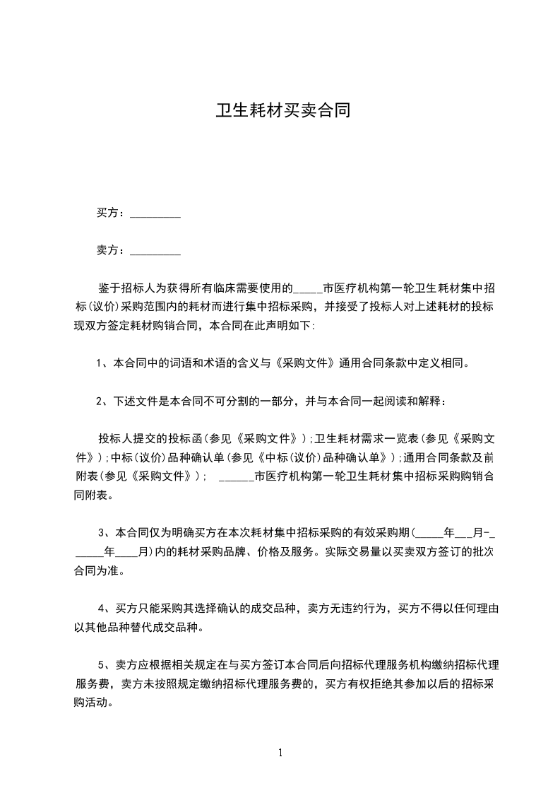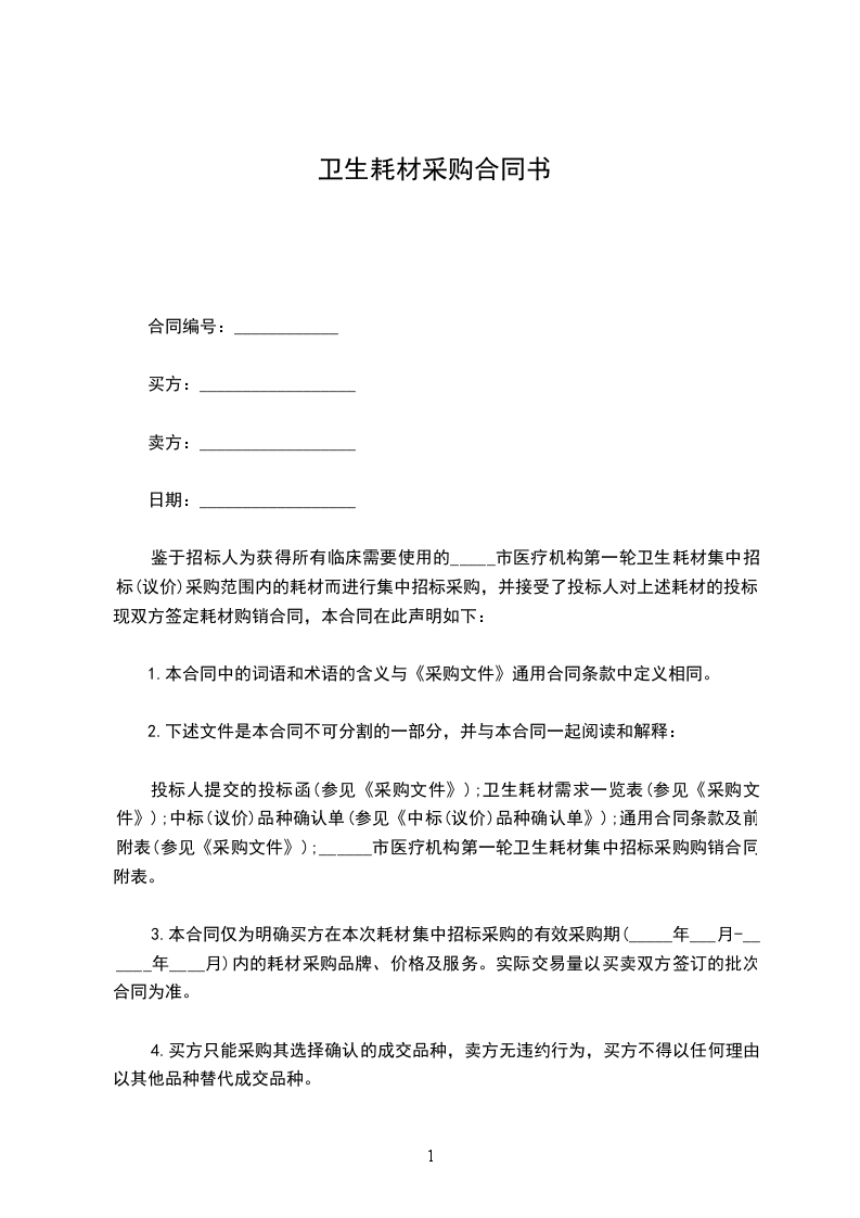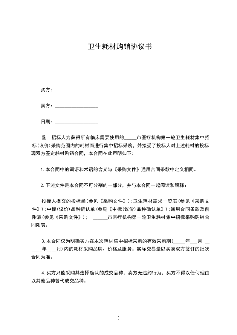 鉴于招标人为获得所有临床需要使用的_____市医疗机构第一轮卫生耗材集中招标(议价)采购范围内的耗材而进行集中招标采购,并接受了投标人对上述耗材的投标。现双方签定耗材购销合同,本合同在此声明如下: