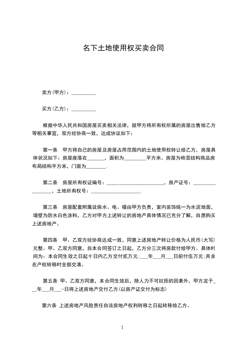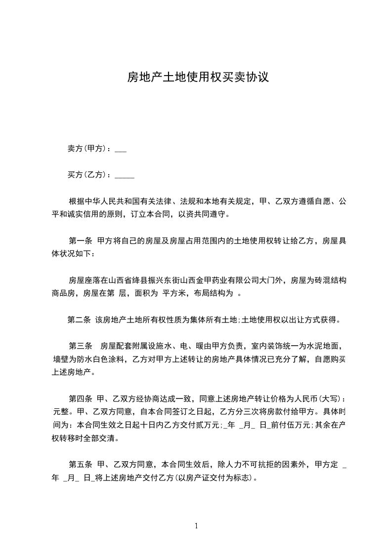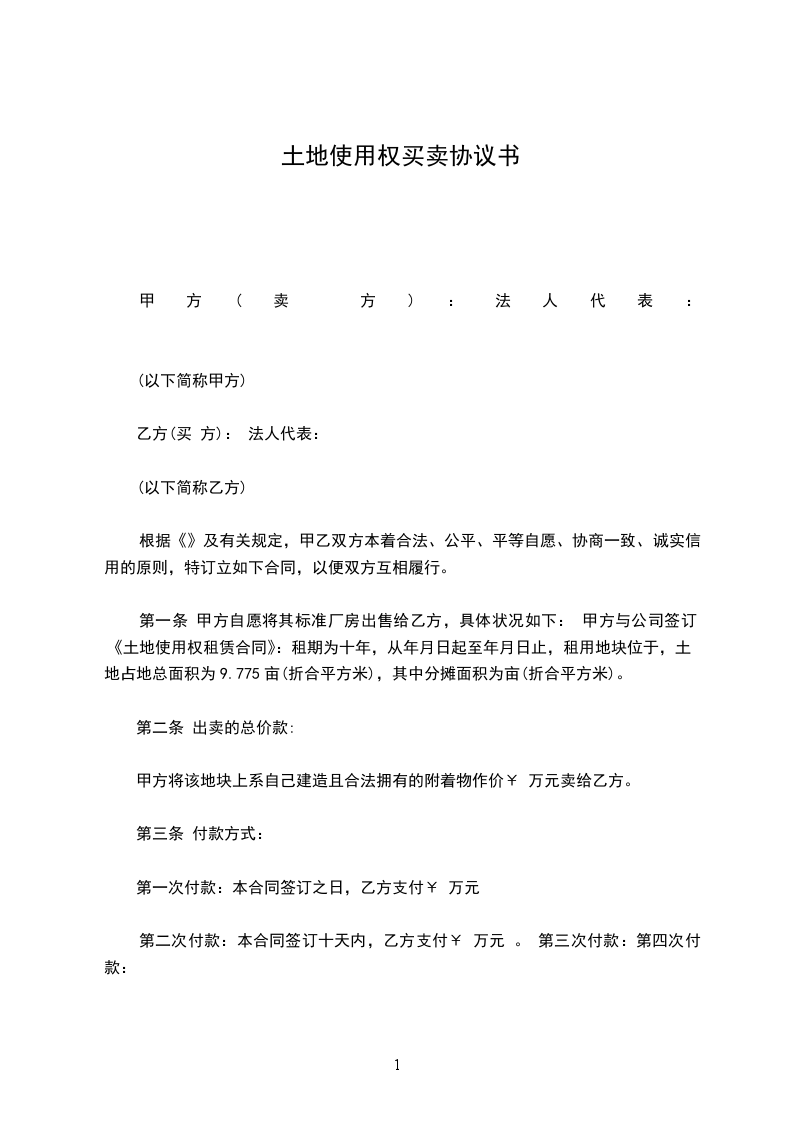 第一条 甲方自愿将其标准厂房出售给乙方,具体状况如下: 甲方与公司签订《土地使用权租赁合同》:租期为十年,从_____年_____月_____日起至_____年_____月_____日止,租用地块位于,土地占地总面积为9.775亩(折合平方米),其中分摊面积为_____亩(折合平方米)。