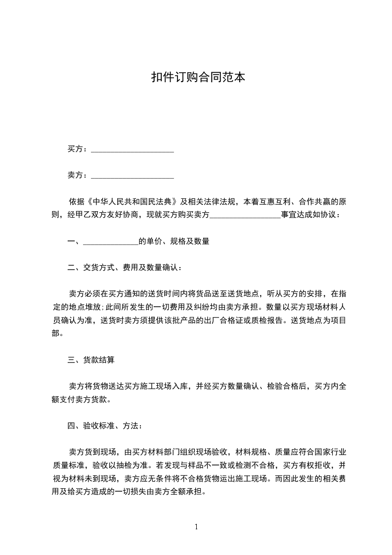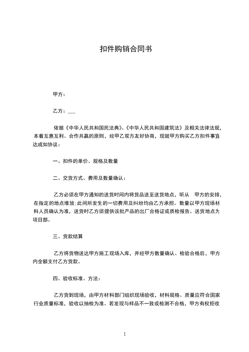 依据《中华人民共和国民法典》、《中华人民共和国建筑法》及相关法律法规,本着互惠互利、合作共赢的原则,经甲乙双方友好协商,现就甲方购买乙方扣件事宜达成如协议: