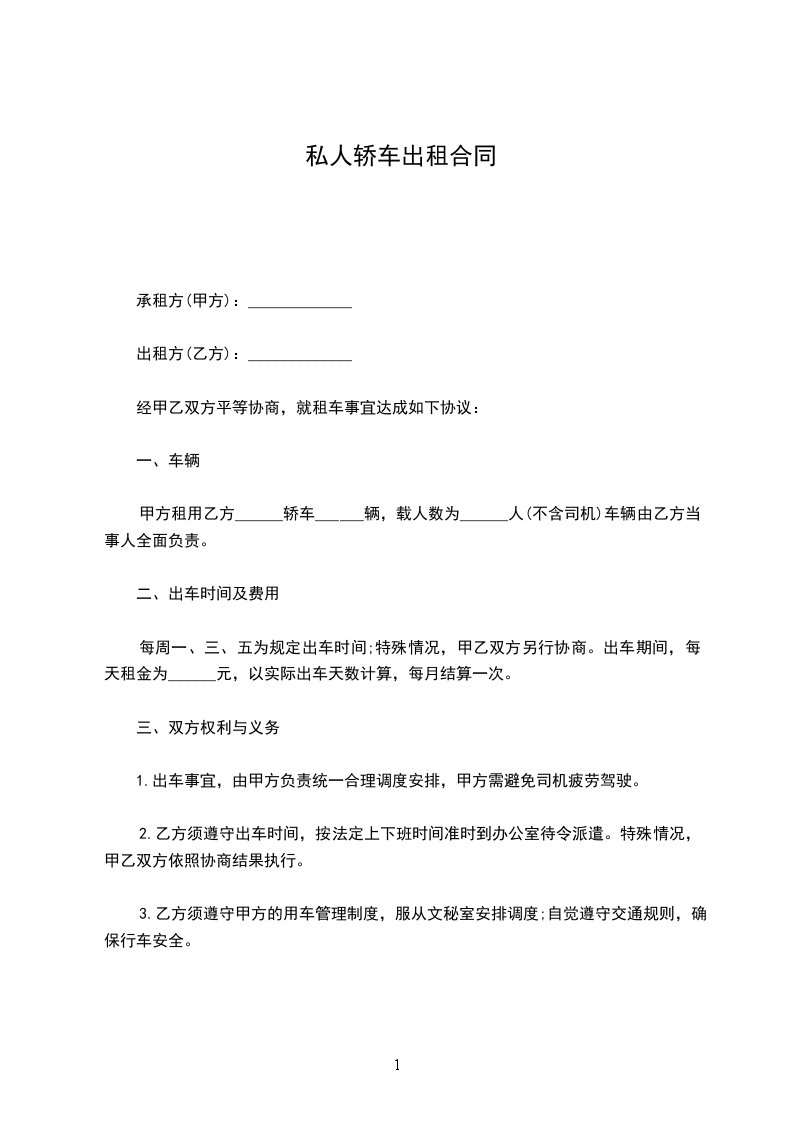 经甲乙双方协商,甲方愿将个人出租车冀 租给乙方使用,特立合同为凭,条款如下: