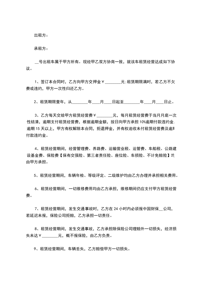 十、承包期间车辆如发生盗抢、丢失或交通事故死亡,甲方不负责任何责任。乙方赔偿甲方车辆(按年限计算)和相关手续的一切费用。承包期间如因乙方不遵守交通规则,造成的后果(如扣分、罚款等)由乙方全权负责。