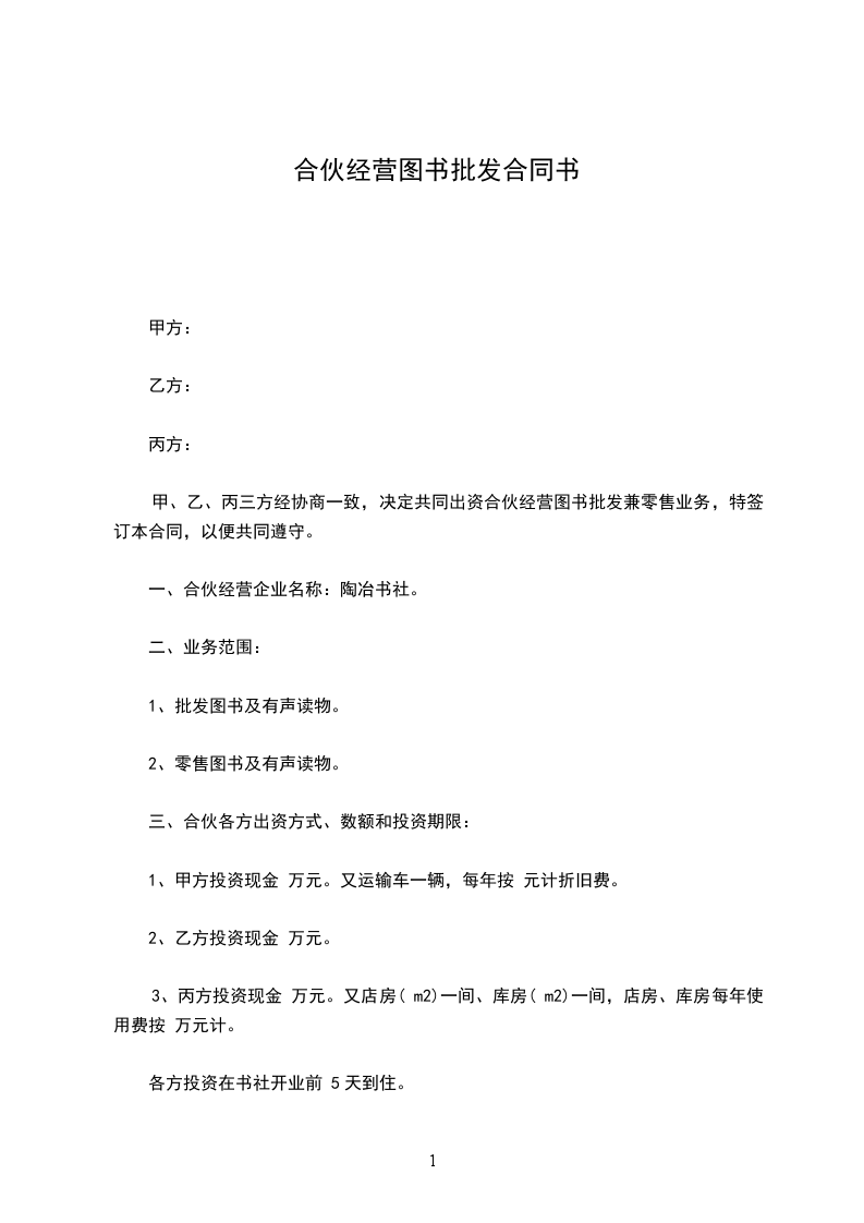甲、乙、丙三方经协商一致,决定共同出资合伙经营图书批发兼零售业务,特签订本合同,以便共同遵守。
