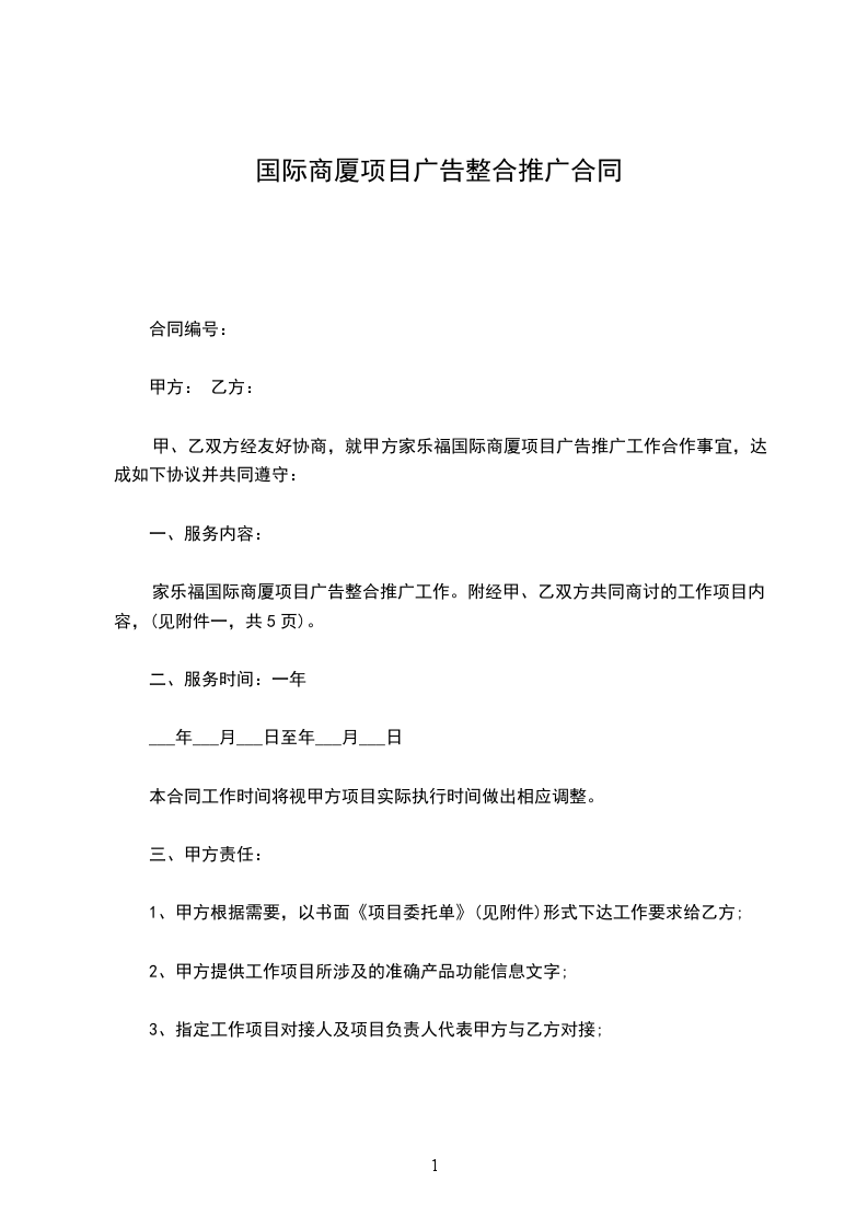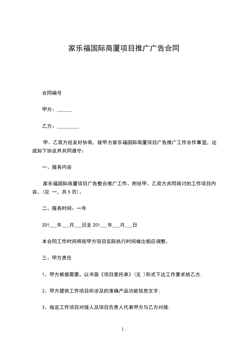 家乐福国际商厦项目广告整合推广工作。附经甲、乙双方共同商讨的工作项目内容,(见附件一,共5页)。