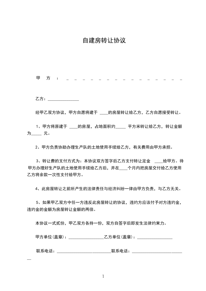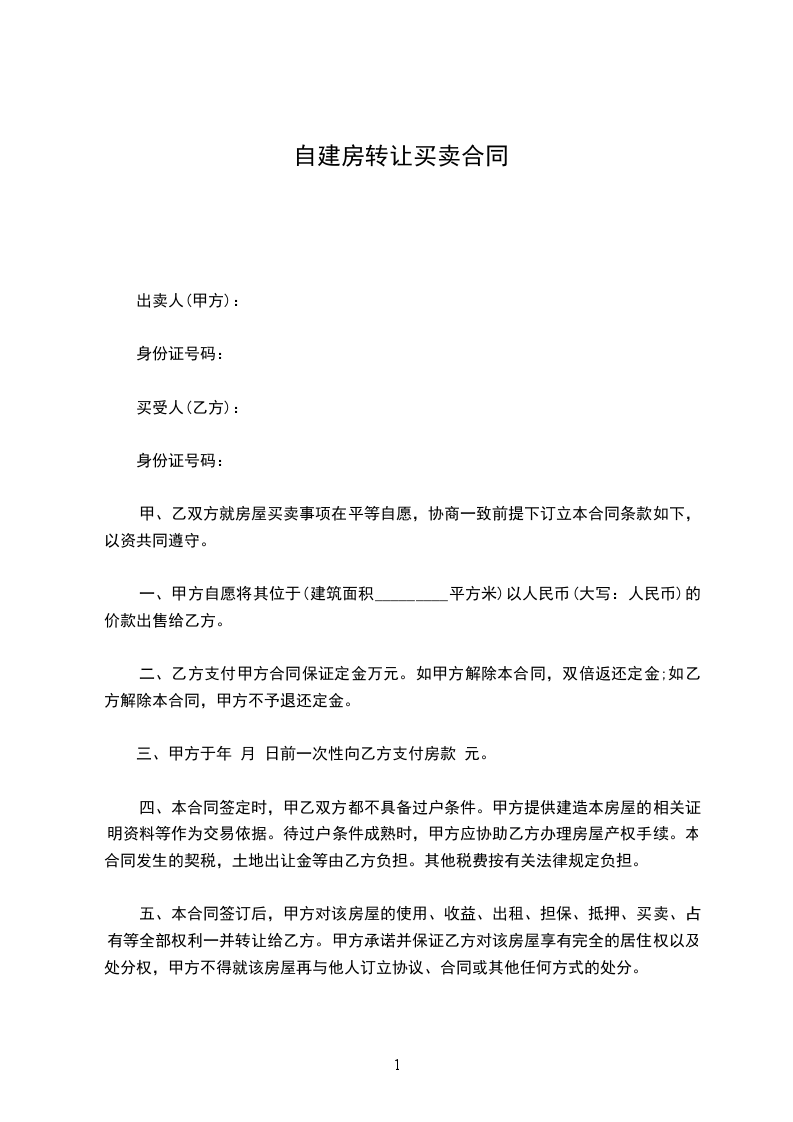 四、本合同签定时,甲乙双方都不具备过户条件。甲方提供建造本房屋的相关证明资料等作为交易依据。待过户条件成熟时,甲方应协助乙方办理房屋产权手续。本合同发生的契税,土地出让金等由乙方负担。其他税费按有关法律规定负担。