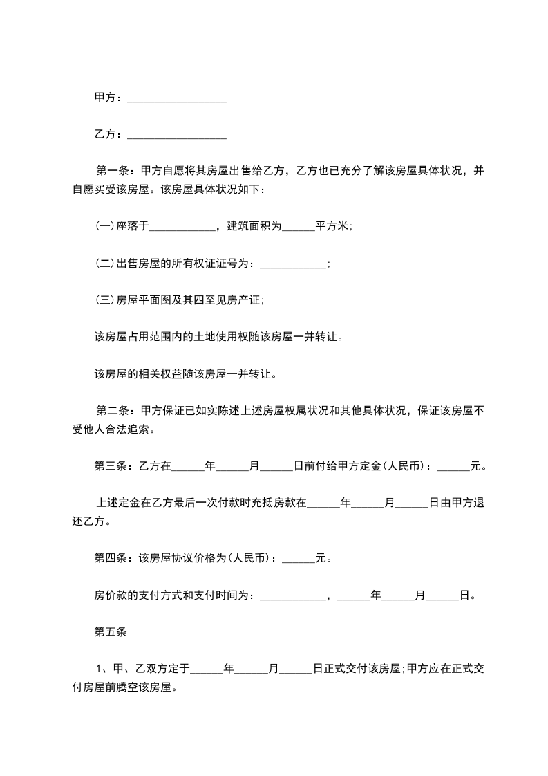 五、本合同签订后,甲方对该房屋的使用、收益、出租、担保、抵押、买卖、占有等全部权利一并转让给乙方。甲方承诺并保证乙方对该房屋享有完全的居住权以及处分权,甲方不得就该房屋再与他人订立协议、合同或其他任何方式的处分。