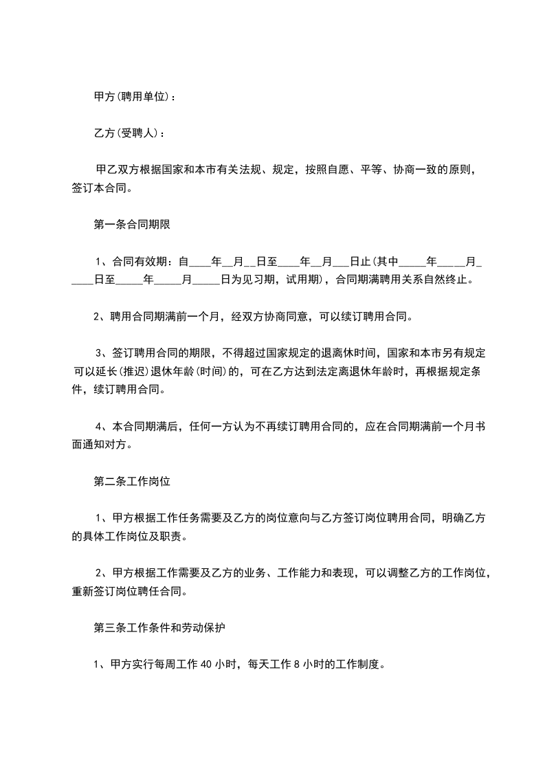 3、签订聘用合同的期限,不得超过国家规定的退离休时间,国家和本市另有规定可以延长(推迟)退休年龄(时间)的,可在乙方达到法定离退休年龄时,再根据规定条件,续订聘用合同。