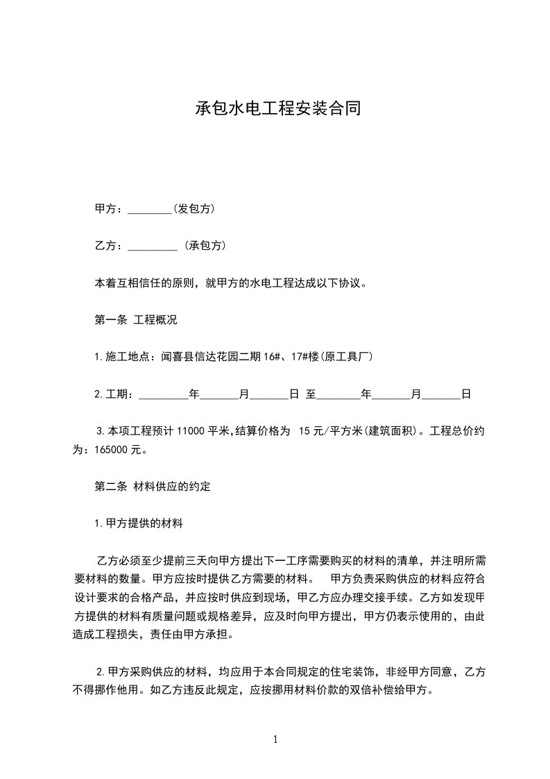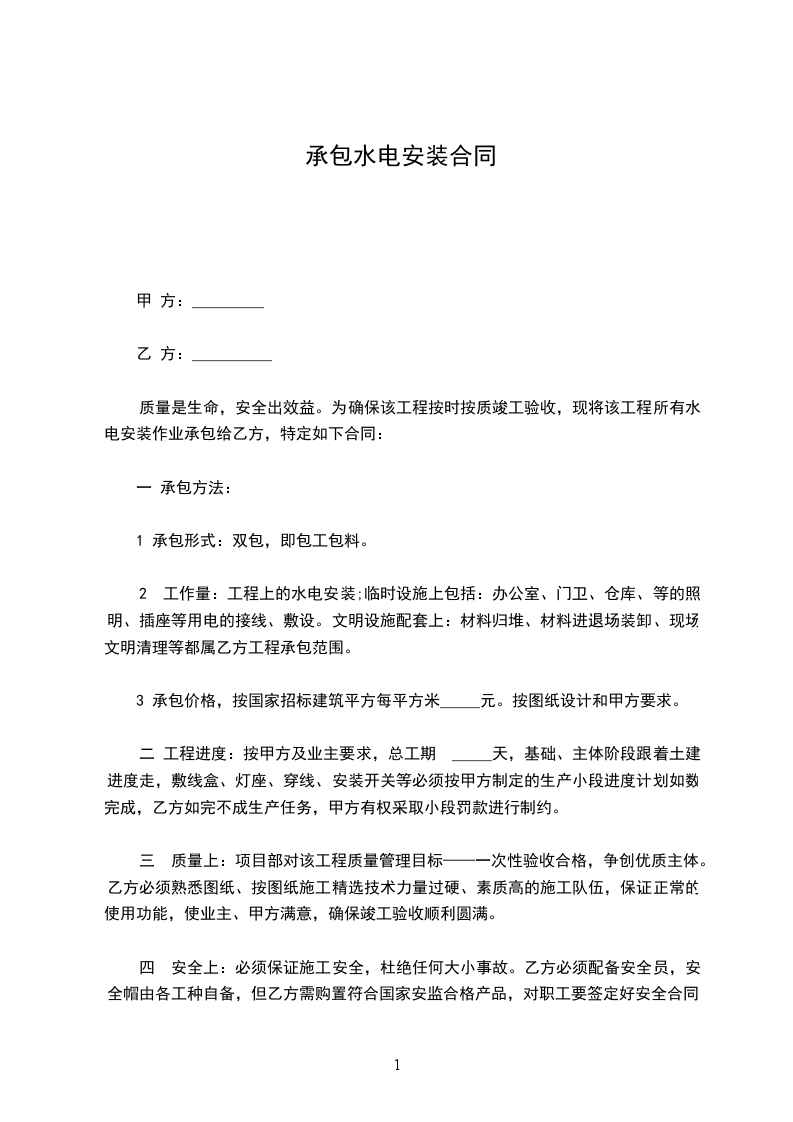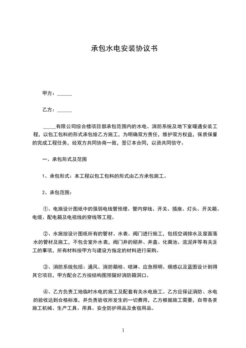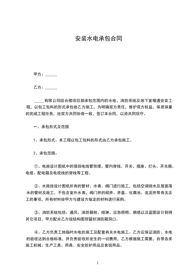 ⑴、 承包工种: 水电(其中包括强电、弱电、给、排水、消防、