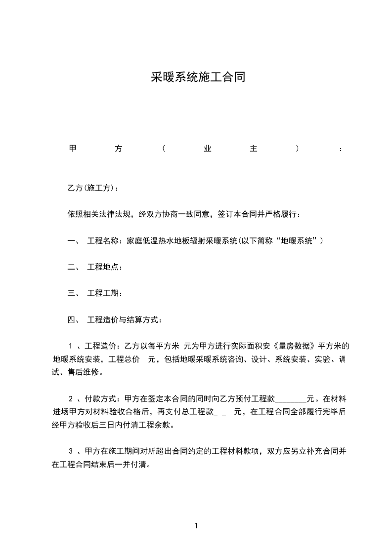 1 、工程造价:乙方以每平方米 元为甲方进行实际面积安《量房数据》平方米的地暖系统安装,工程总价 元,包括地暖采暖系统咨询、设计、系统安装、实验、调试、售后维修。
