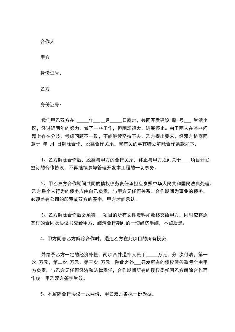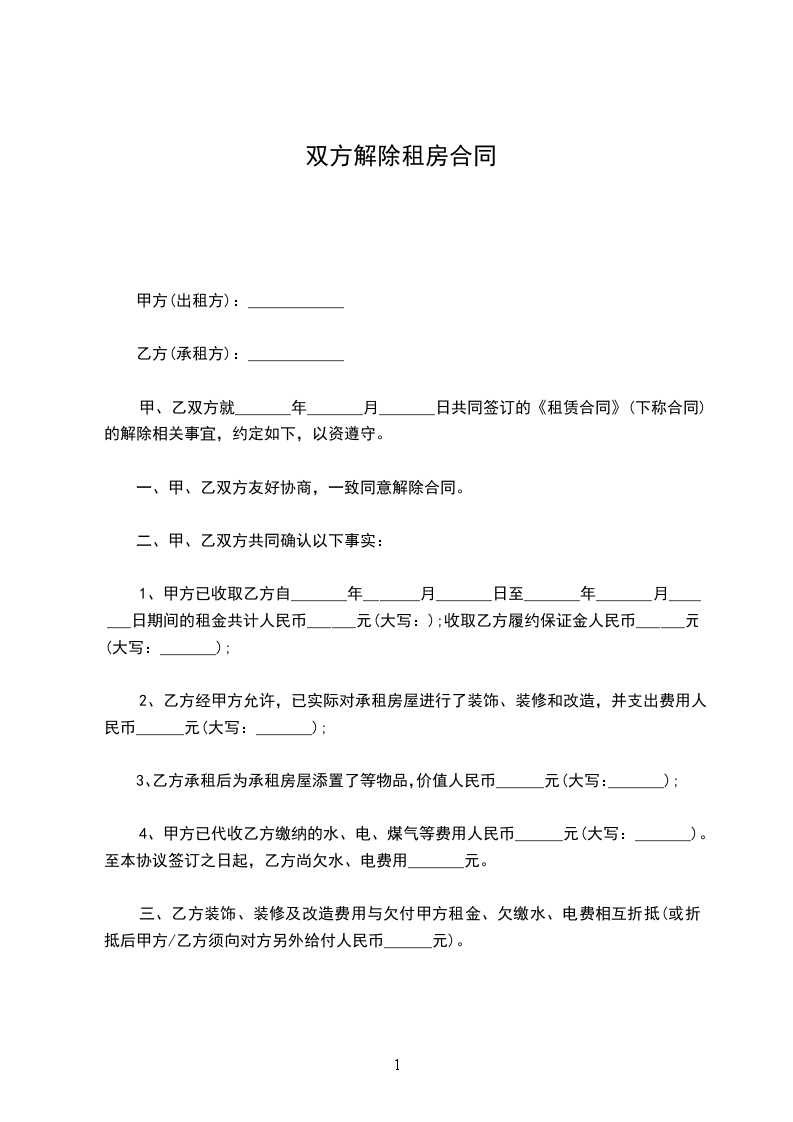 一:甲乙双方同意解除_____年___月____日签订 的《__________》及其它相关协议。自协议解除之日起,甲乙双方彼此之间的权利、义务关系自行消灭。甲乙双方相互不再以任何形式追求对方的违约责任。