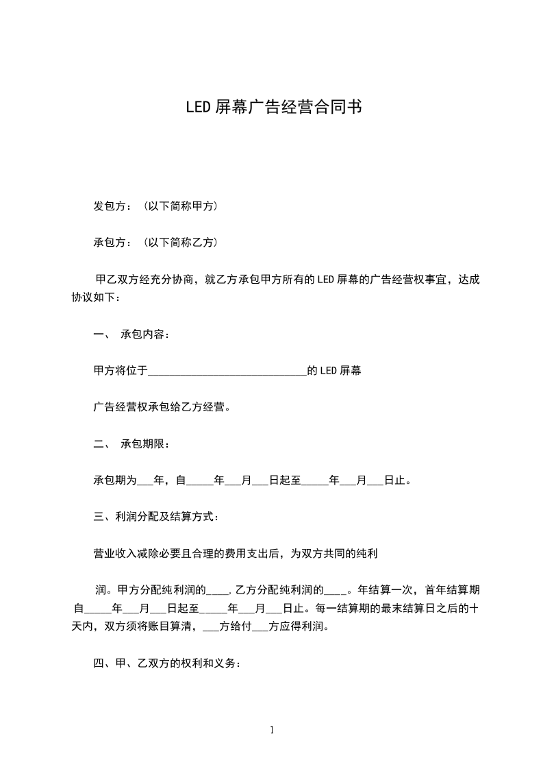 甲乙双方经充分协商,就乙方承包甲方所有的LED屏幕的广告经营权事宜,达成协议如下: