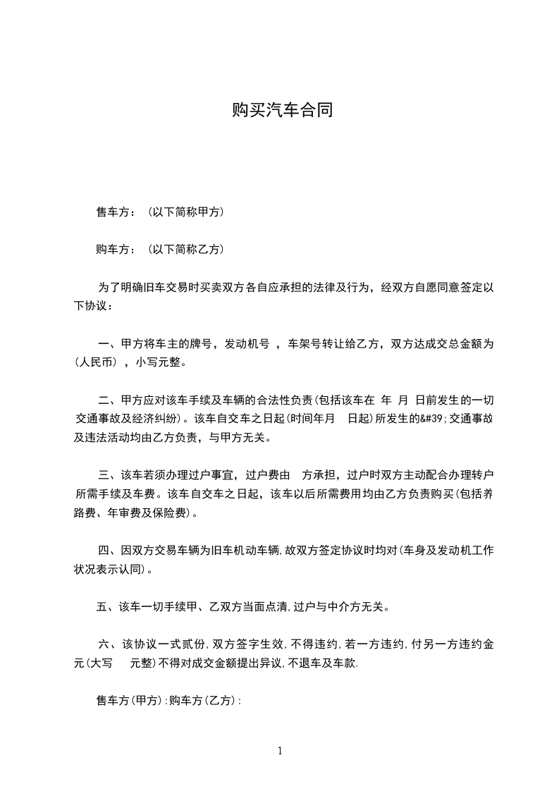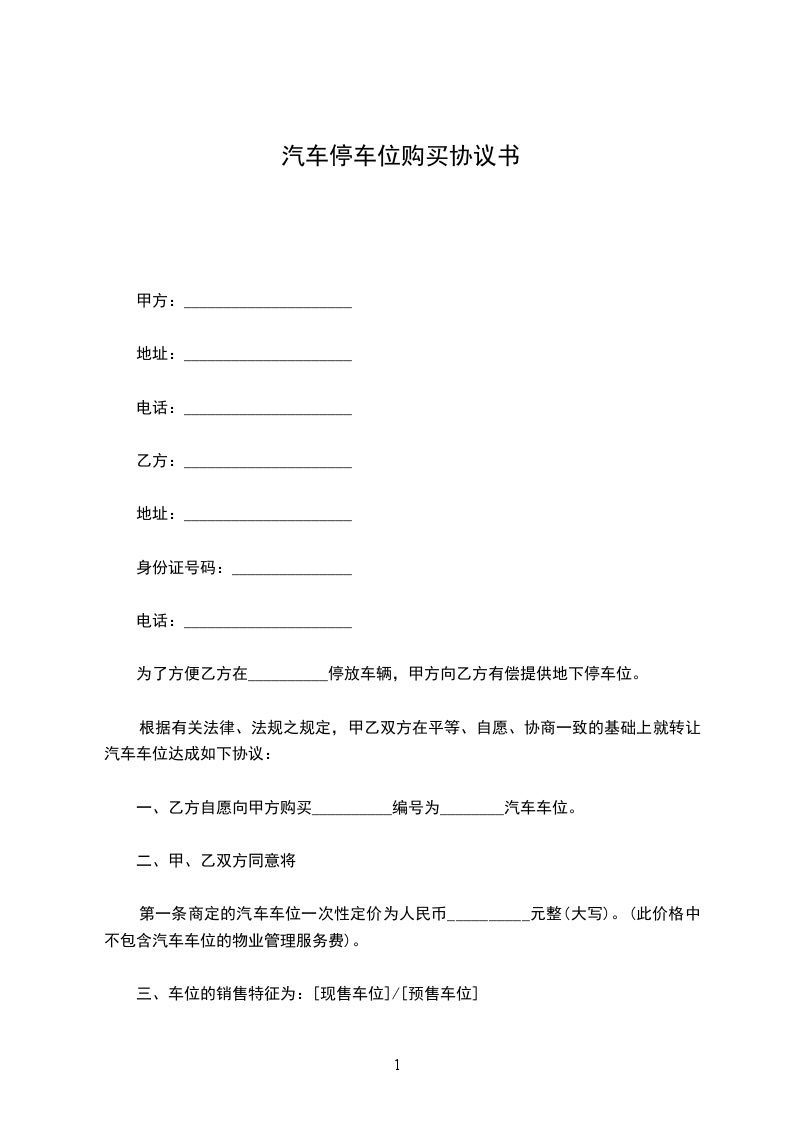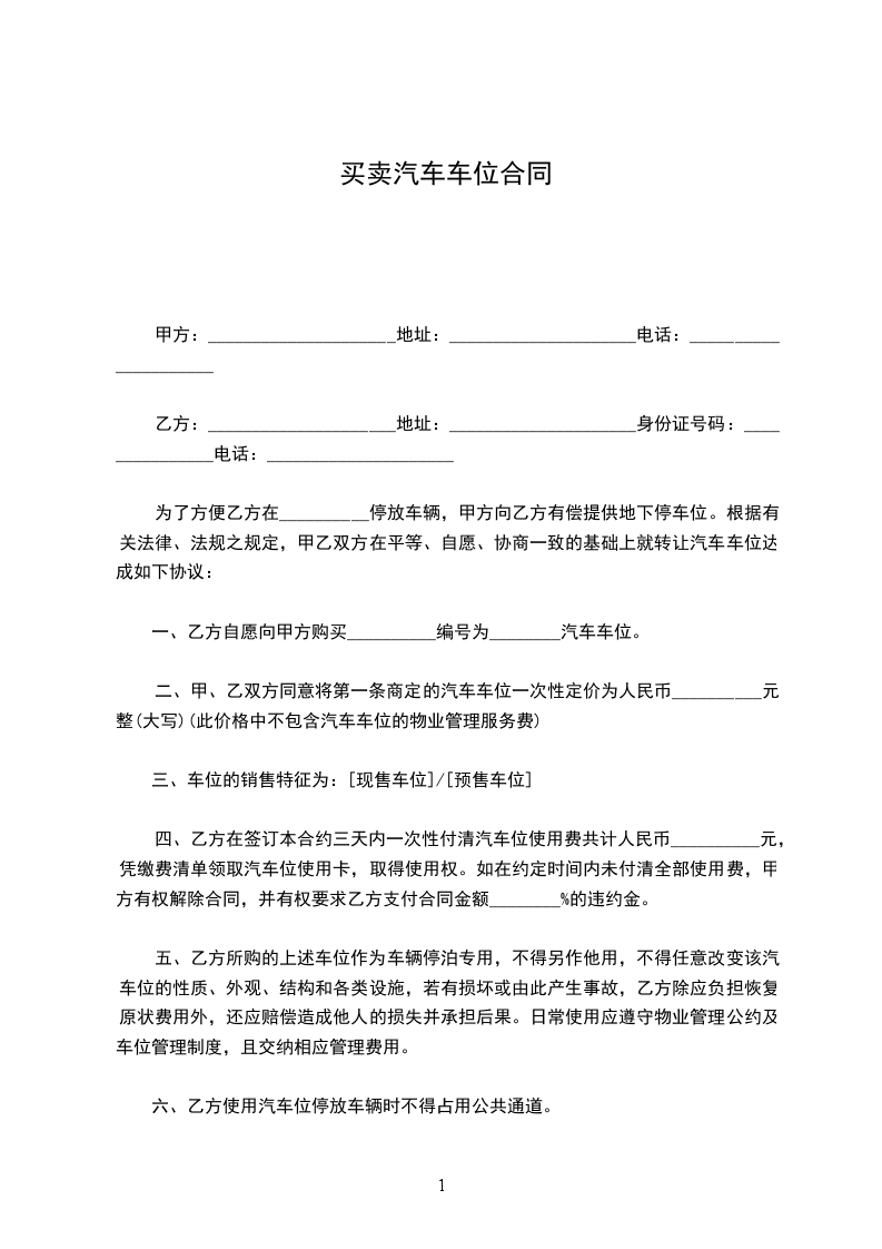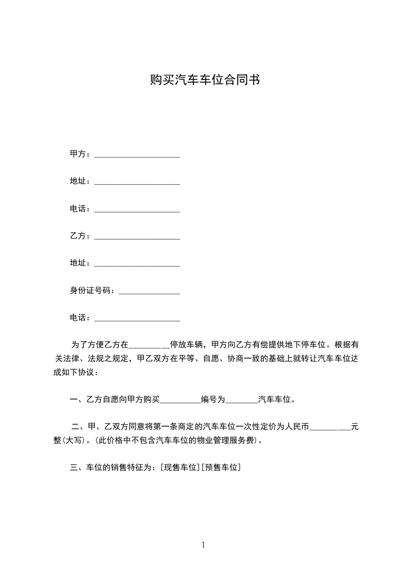 一、乙方自愿向甲方购买__________编号为________汽车车位。