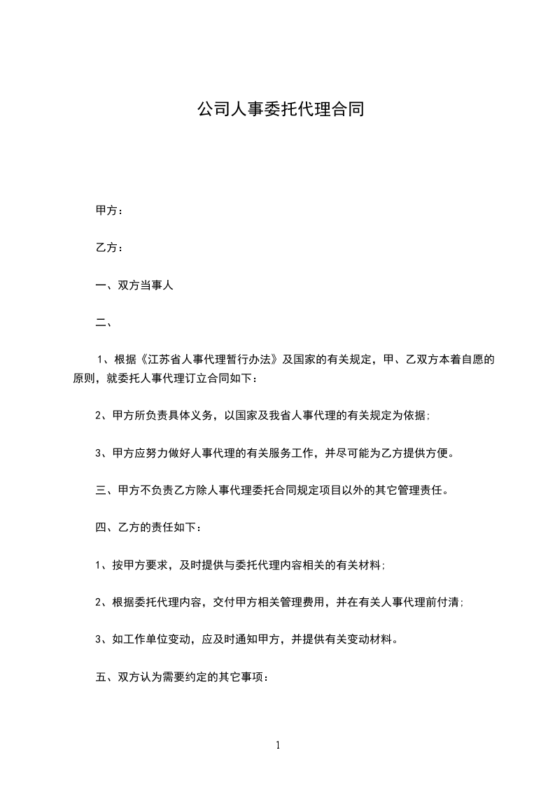 1、根据《江苏省人事代理暂行办法》及国家的有关规定,甲、乙双方本着自愿的原则,就委托人事代理订立合同如下: