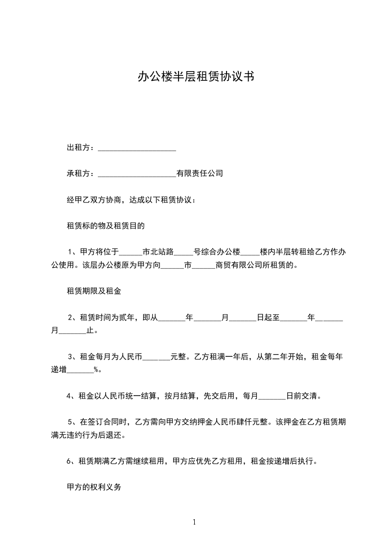 1.甲方将位于______市北站路_____号综合办公楼_____楼内半层转租给乙方作办公使用。该层办公楼原为甲方向______市______商贸有限公司所租赁的。