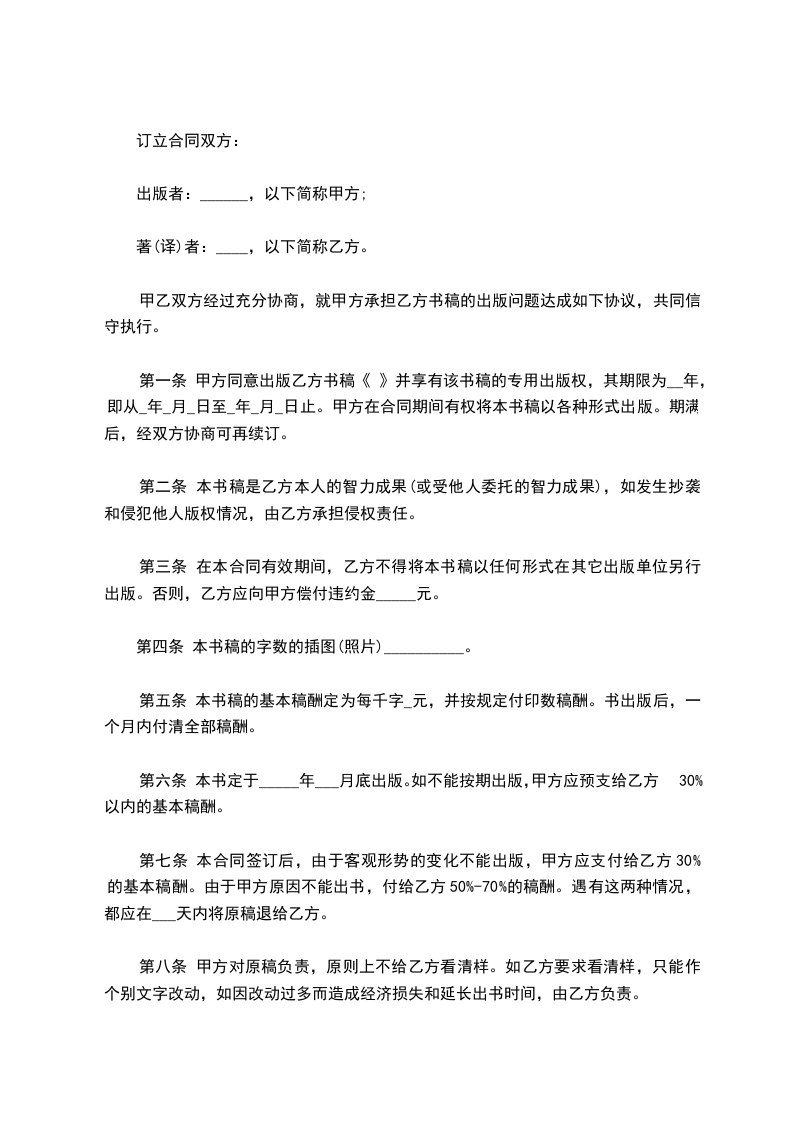 第八条 著作稿(或译稿)的出版合同签订后,本合同即自行失效。