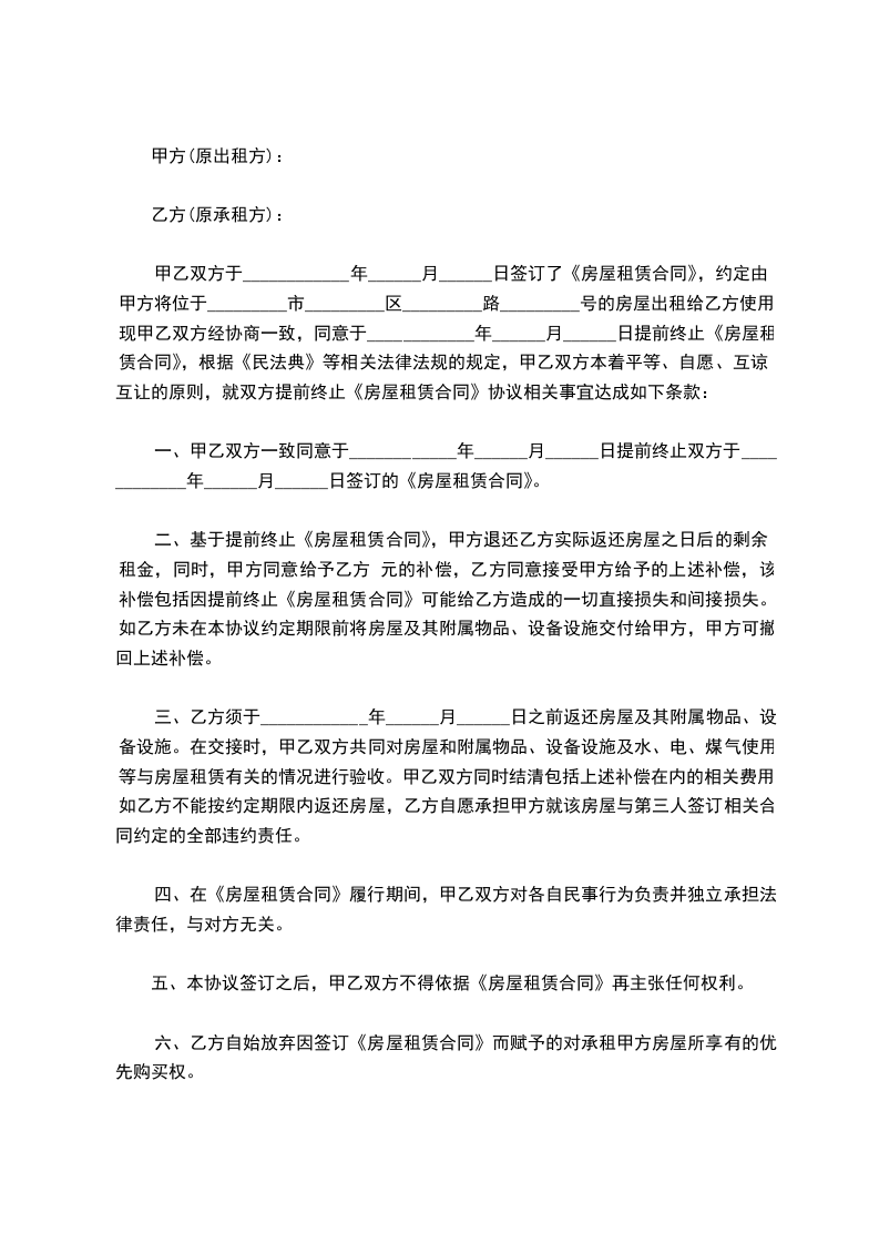 甲乙双方于____________年______月______日签订了《房屋租赁合同》,约定由甲方将位于_________市_________区_________路_________号的房屋出租给乙方使用。现甲乙双方经协商一致,同意于____________年______月______日提前终止《房屋租赁合同》,根据《民法典》等相关法律法规的规定,甲乙双方本着平等、自愿、互谅互让的原则,就双方提前终止《房屋租赁合同》协议相关事宜达成如下条款: