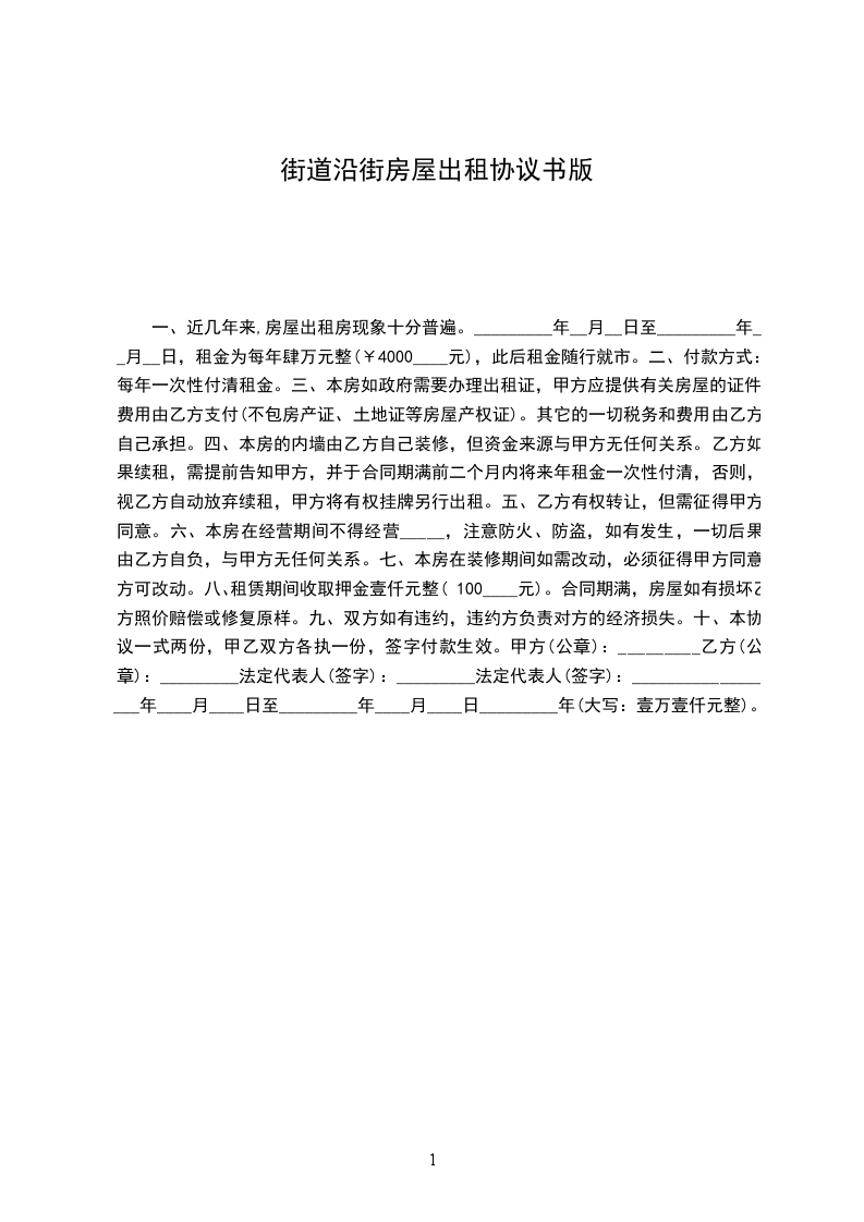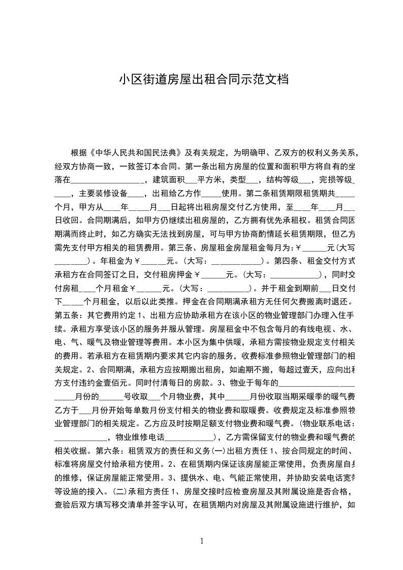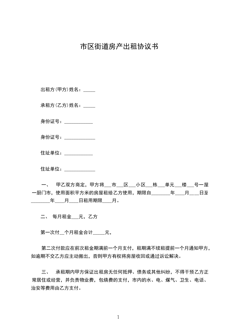 一、 甲乙双方商定,甲方将___市___区___小区___栋___单元___楼___号一屋一厨门市,使用面积平方米的房屋租给乙方使用,期限自________年____月____日至________年____月____日租用期限____月。