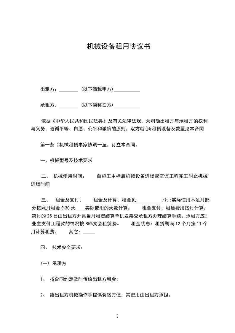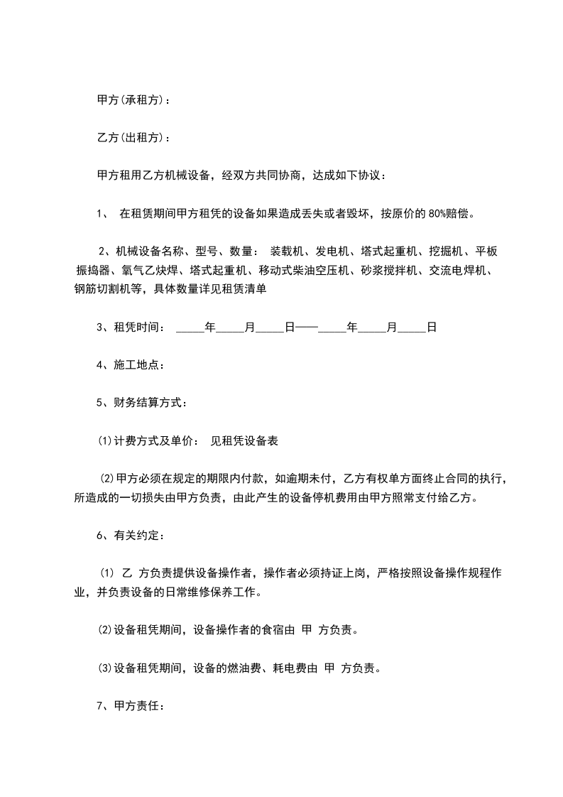 甲方租用乙方机械设备,经双方共同协商,达成如下协议: