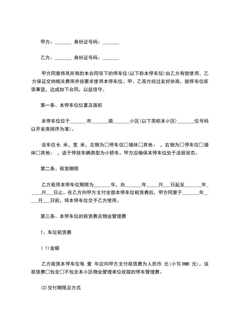 甲乙双方议定月/年租金 元。乙方需月/年租用车位,应按月/年一次性缴纳给 甲方车位租用费, 先付款后使用, 甲方从 年 月 日至 年 月 日止, 收到乙方车位租用费月/年 元整。