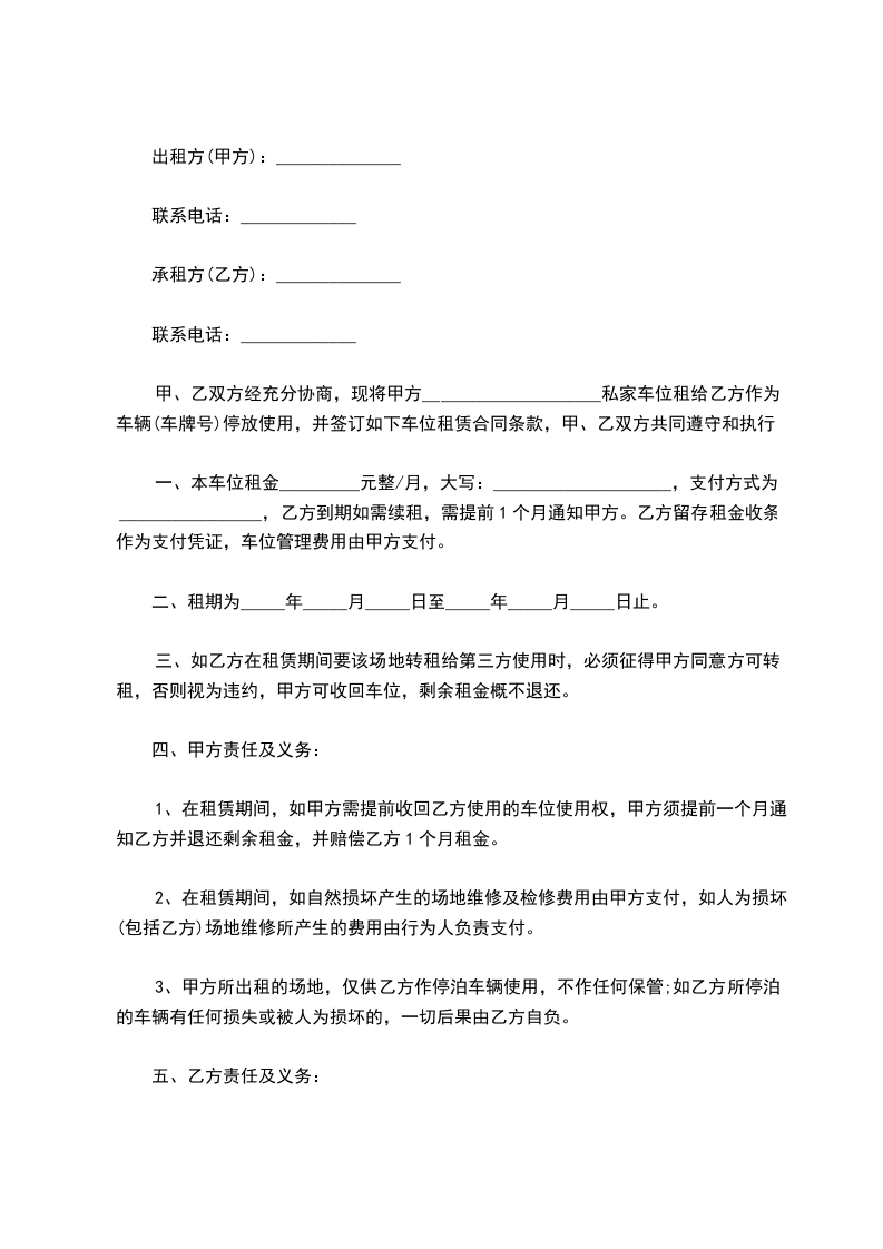 出租期限共 个月/年, 甲方从 年 月 日起将本小区负一层 号 车位出租给乙方使用,至 年 月 日止,到期后本协议自动废除。