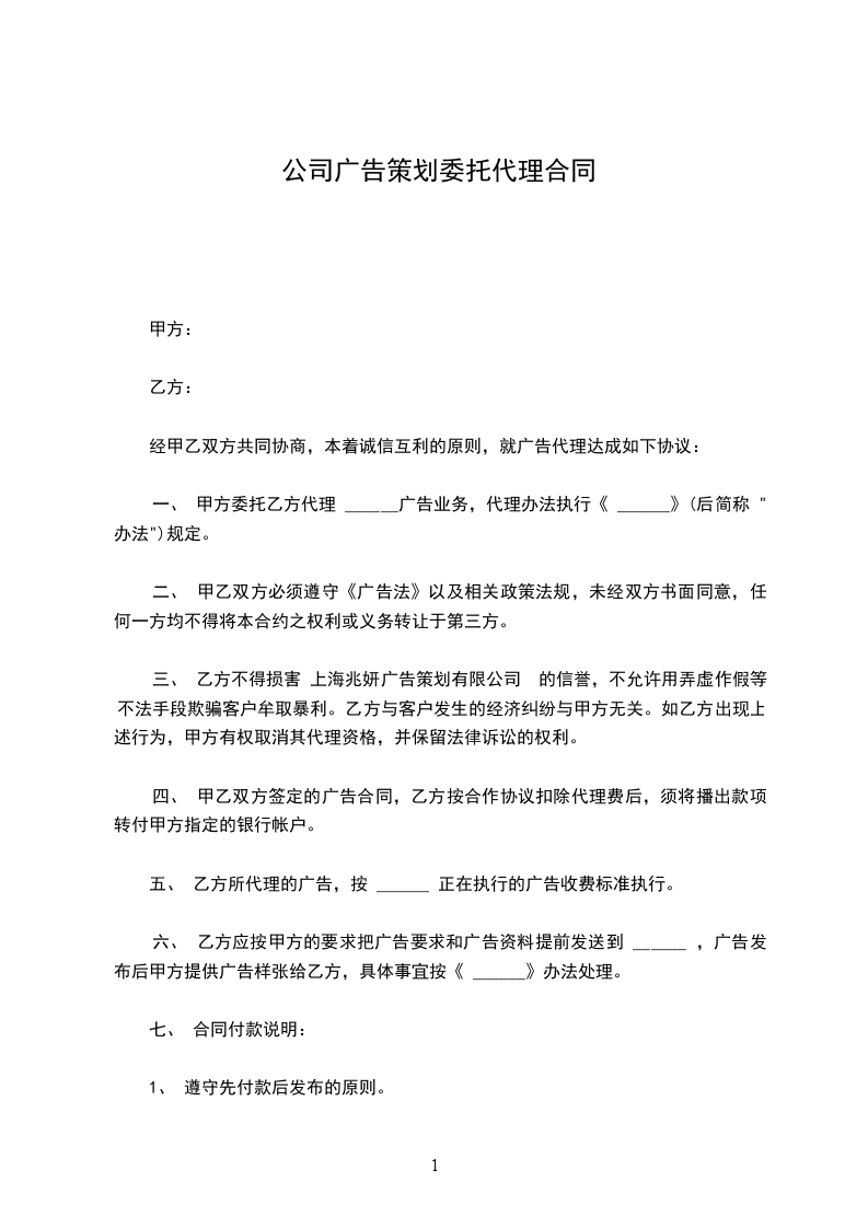 一、 甲方委托乙方代理 ______广告业务,代理办法执行《 ______》(后简称 "办法")规定。