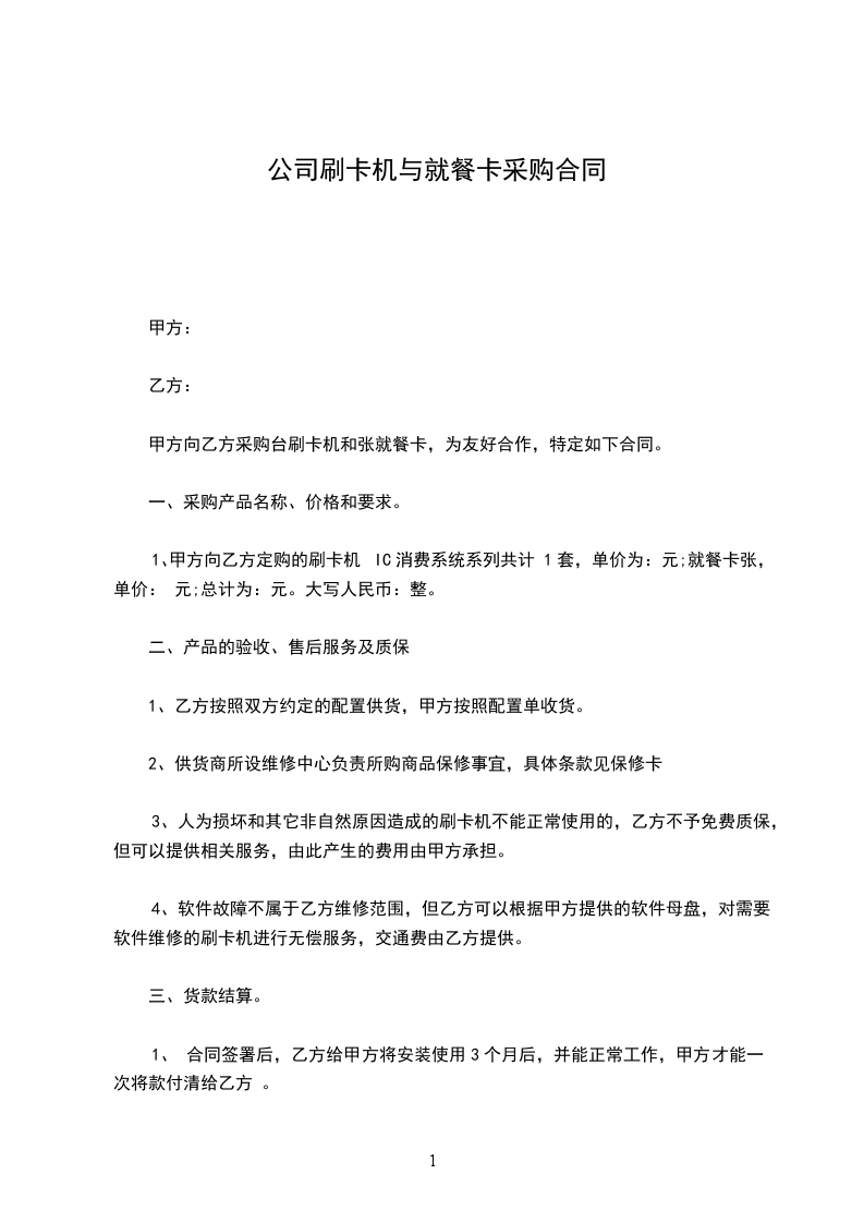 1、甲方向乙方定购的刷卡机IC消费系统系列共计 1套,单价为:元;就餐卡张,单价: 元;总计为:元。大写人民币:整。