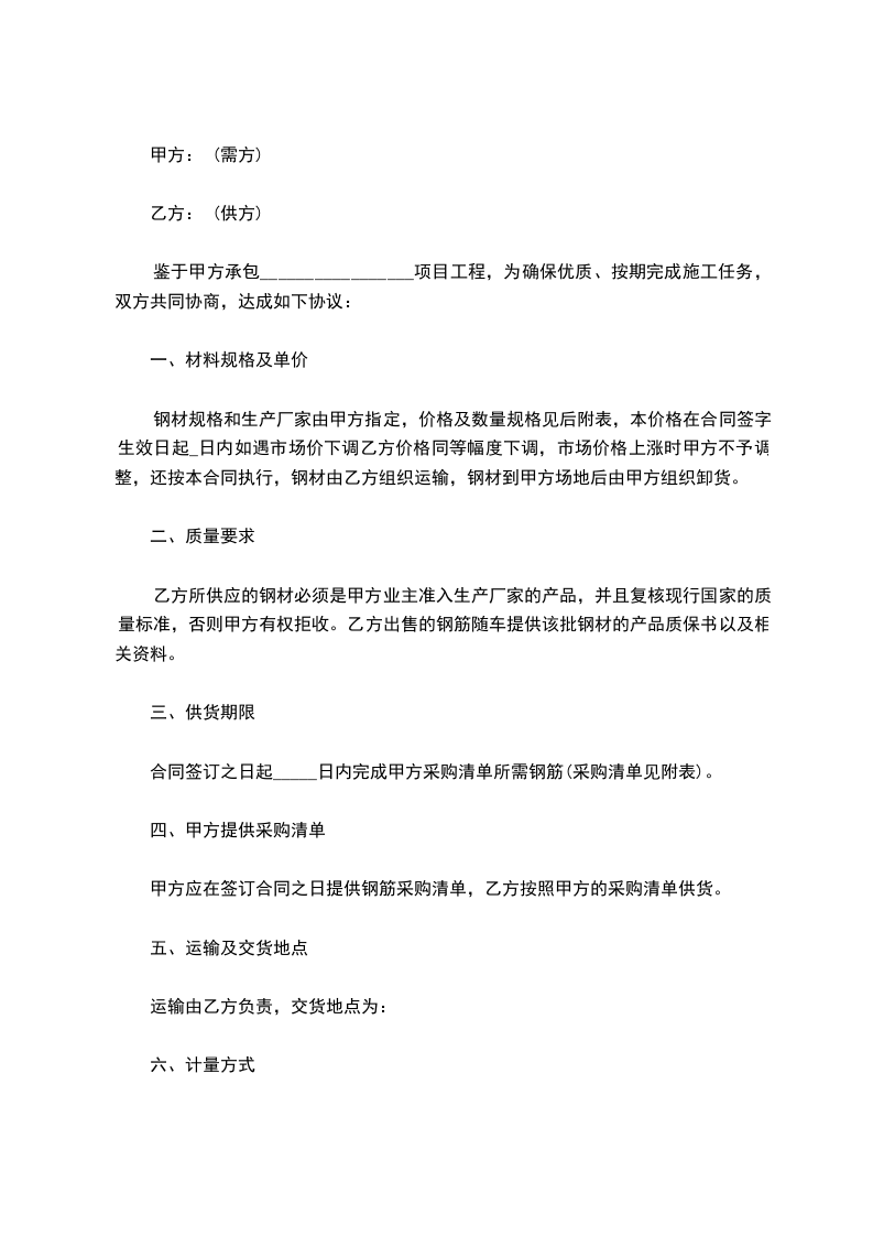 合同签订之日起_____日内完成甲方采购清单所需钢筋(采购清单见附表)。