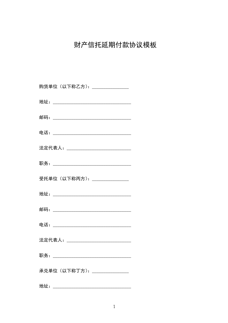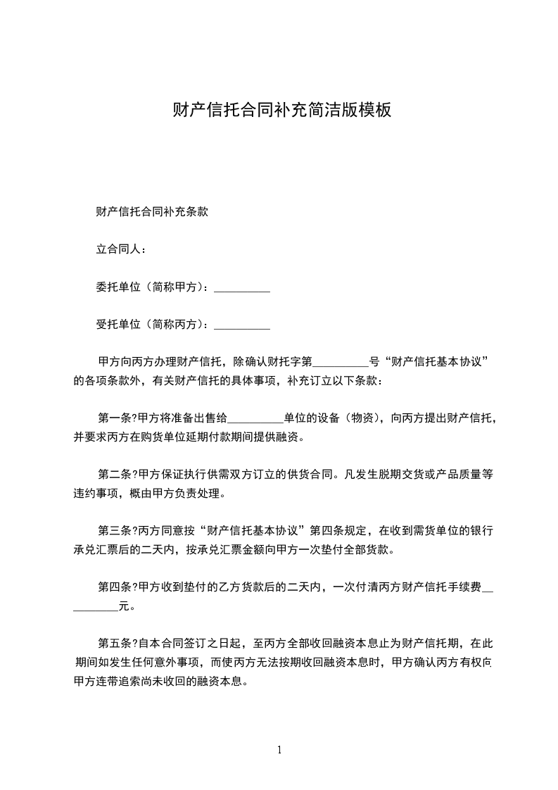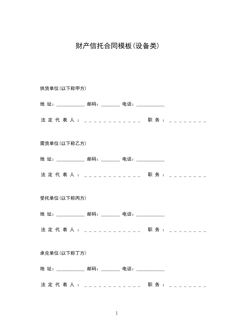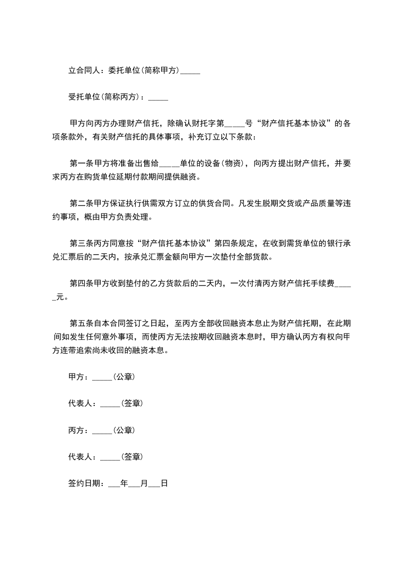 第一条甲方将准备出售给_____单位的设备(物资),向丙方提出财产信托,并要求丙方在购货单位延期付款期间提供融资。