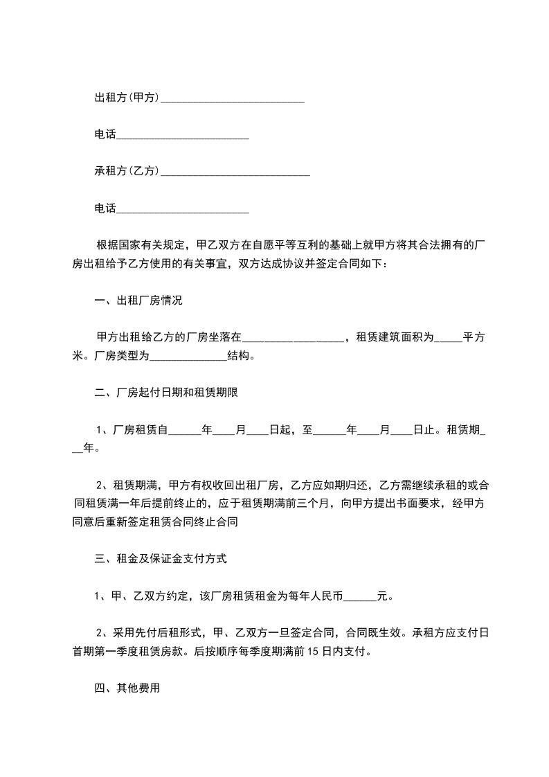 二、乙方租用该厂房期限为三年,即自____年___月__日至____年___月__日止。前30天为装修期,装修期内甲方免收租金。正式起租时间为____年___月__日。