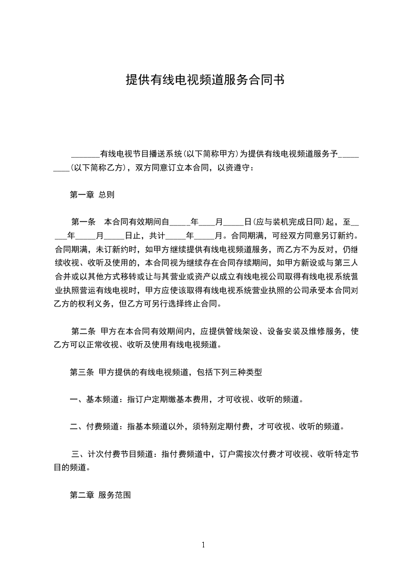 _______有线电视节目播送系统(以下简称甲方)为提供有线电视频道服务予_________(以下简称乙方),双方同意订立本合同,以资遵守:
