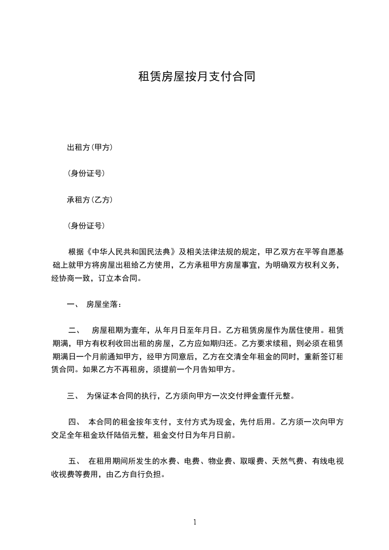 二、 房屋租期为壹年,从_____年_____月_____日至_____年_____月_____日。乙方租赁房屋作为居住使用。租赁期满,甲方有权利收回出租的房屋,乙方应如期归还。乙方要求续租,则必须在租赁期满日一个月前通知甲方,经甲方同意后,乙方在交清全年租金的同时,重新签订租赁合同。如果乙方不再租房,须提前一个月告知甲方。