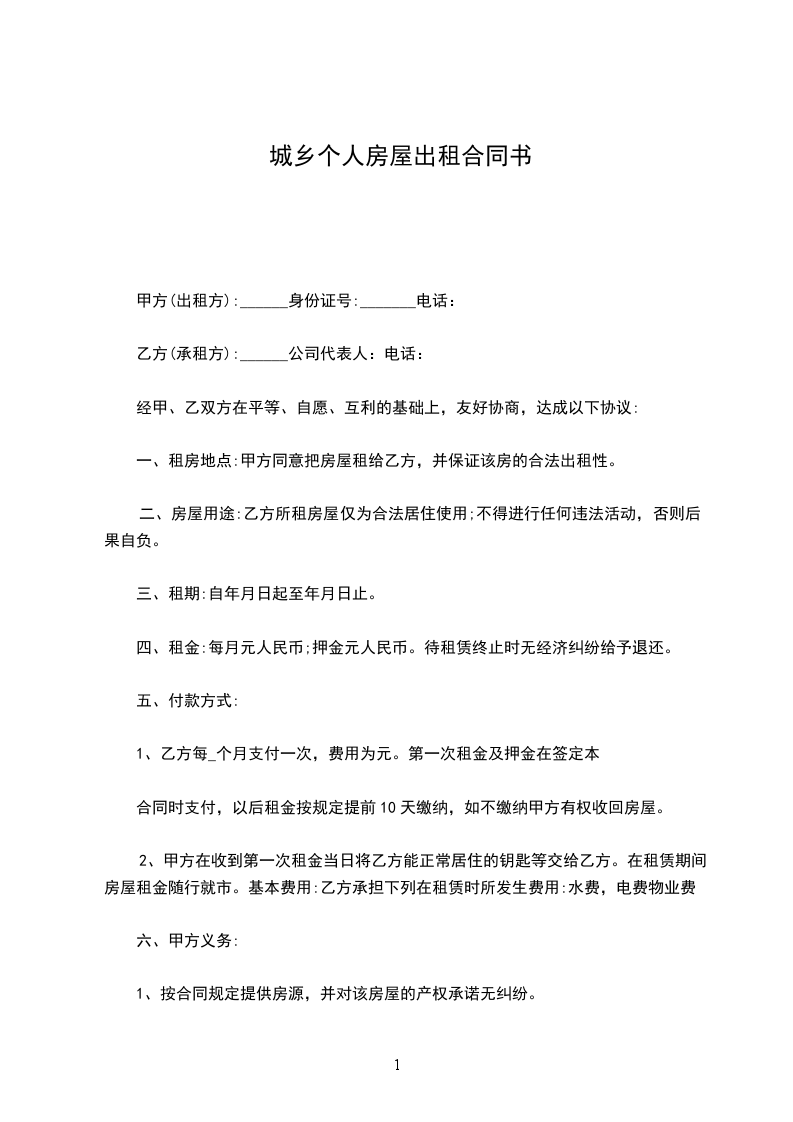 甲方(出租方):______身份证号:_______电话: