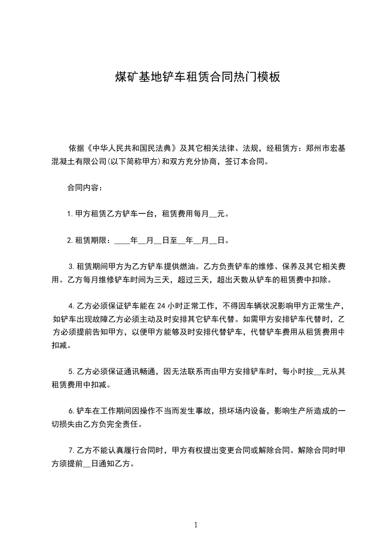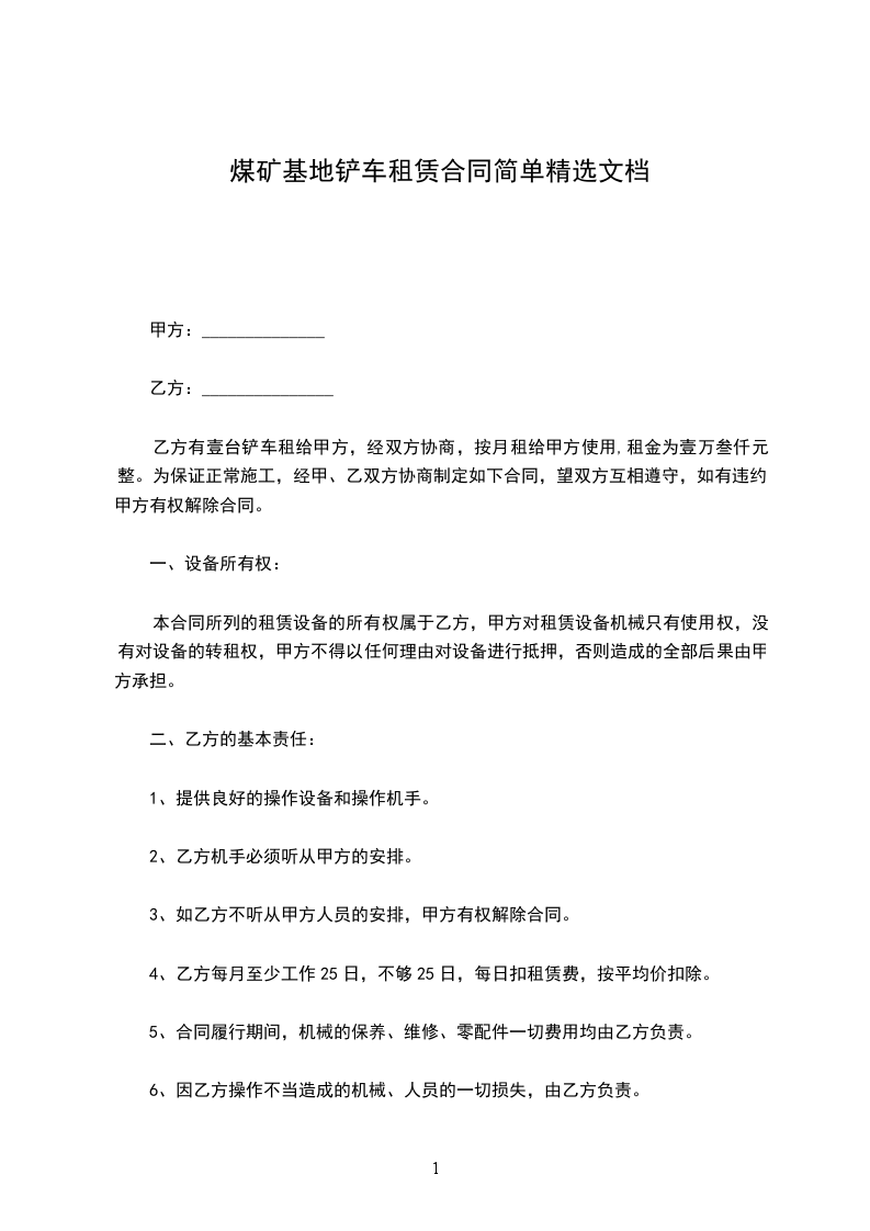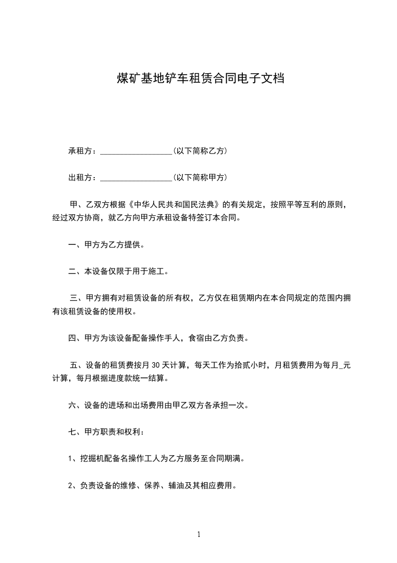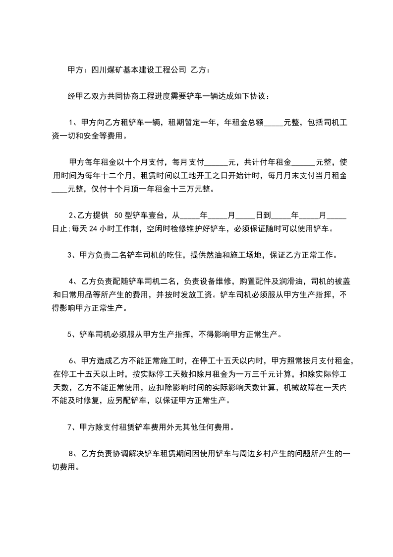 1、甲方向乙方租铲车一辆,租期暂定一年,年租金总额_____元整,包括司机工资一切和安全等费用。